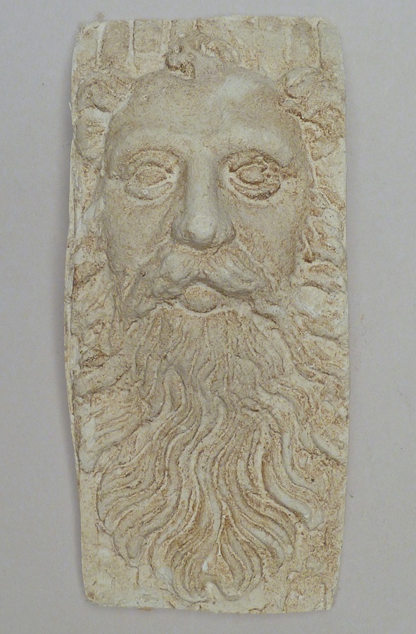 Afgietsel van reliëf met bebaarde mannenkop, van klok van kerk (Dom te Utrecht?, gegoten door Van Wou?)