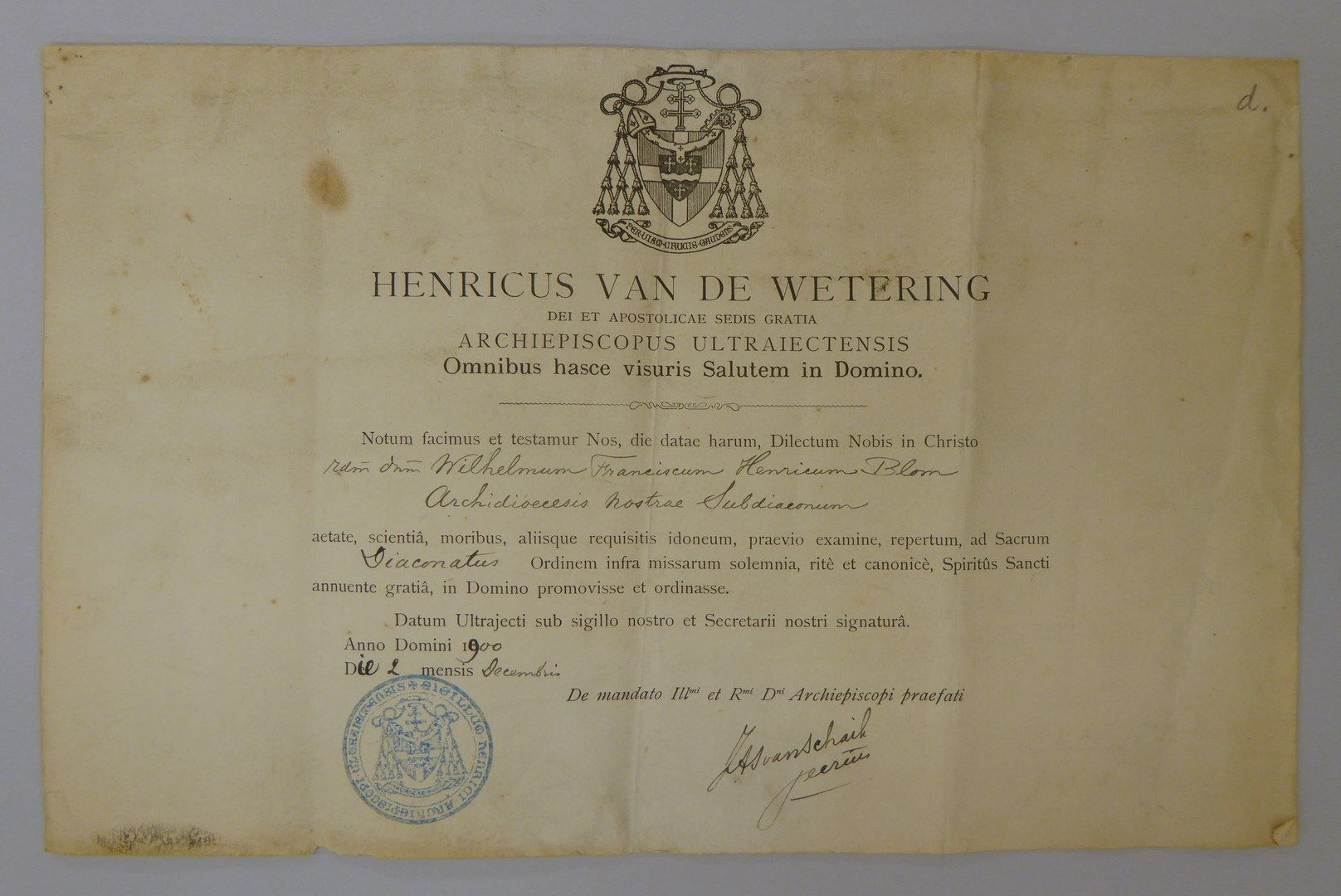Wijdingsbrief W.F.H. Blom door aartsbisschop H. van de Wetering: diaken