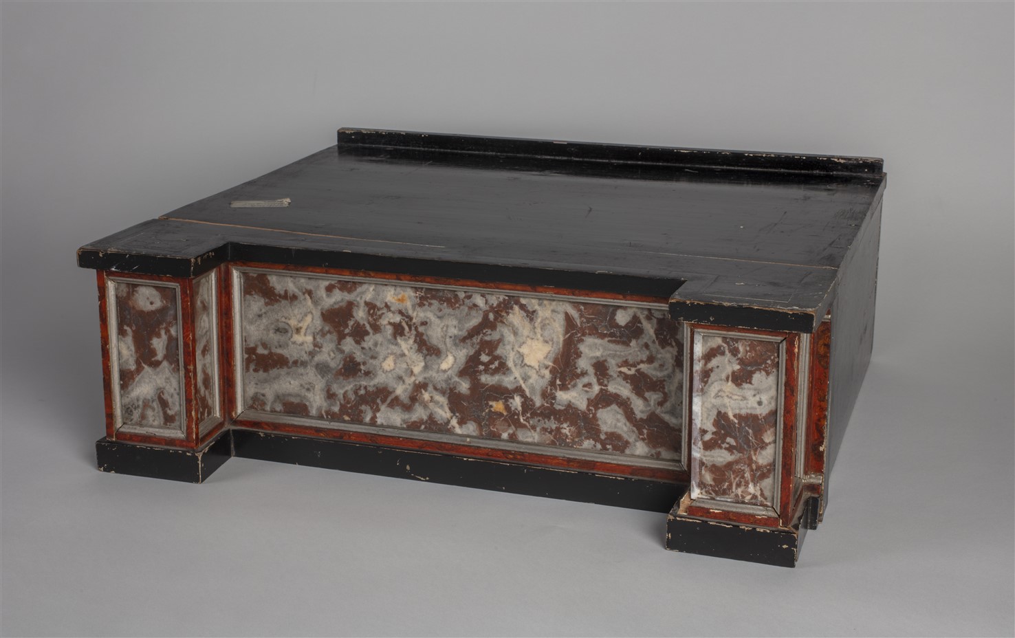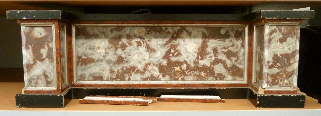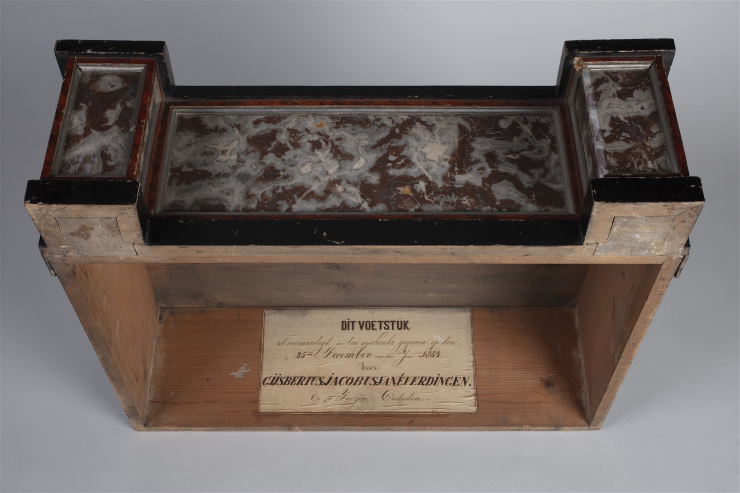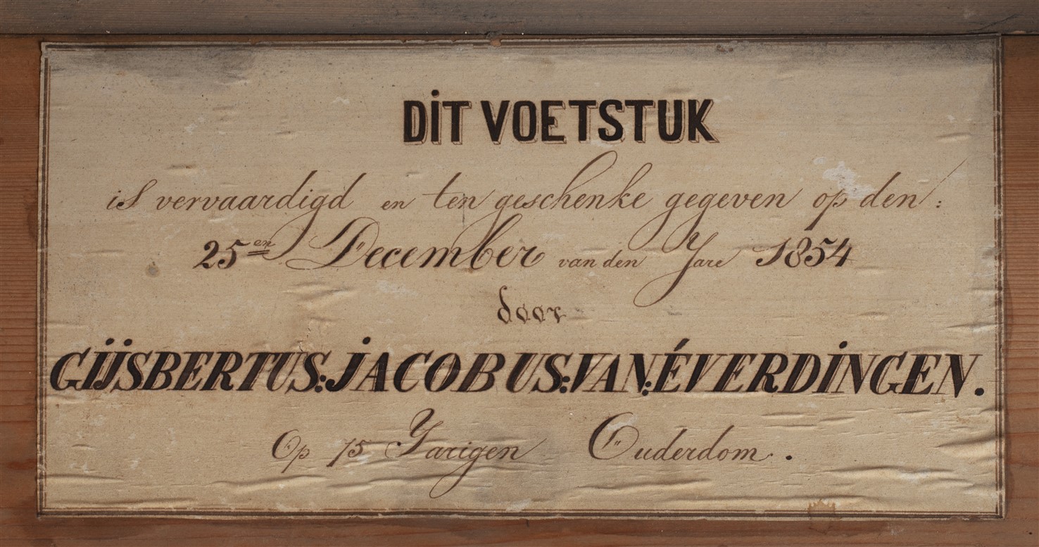 Voetstuk voor een onbekend tabernakel. Aan de binnenzijde is een etiket geplakt met: "Dit voetstuk / is vervaardigd en ten geschenke gegeven op den / 25en december van den jare 1854 / door / Gijsbertus Jacobus van Everdingen. / Op 75 jarigen ouderdom."