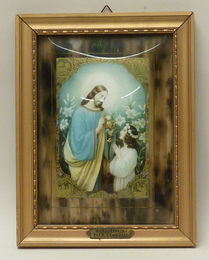 Ingelijste communieprent met meisje dat communie ontvangt van Christus