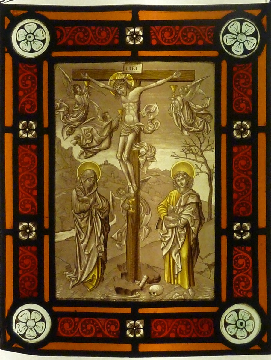 Glasruitje met ketting met voorstelling van calvarie