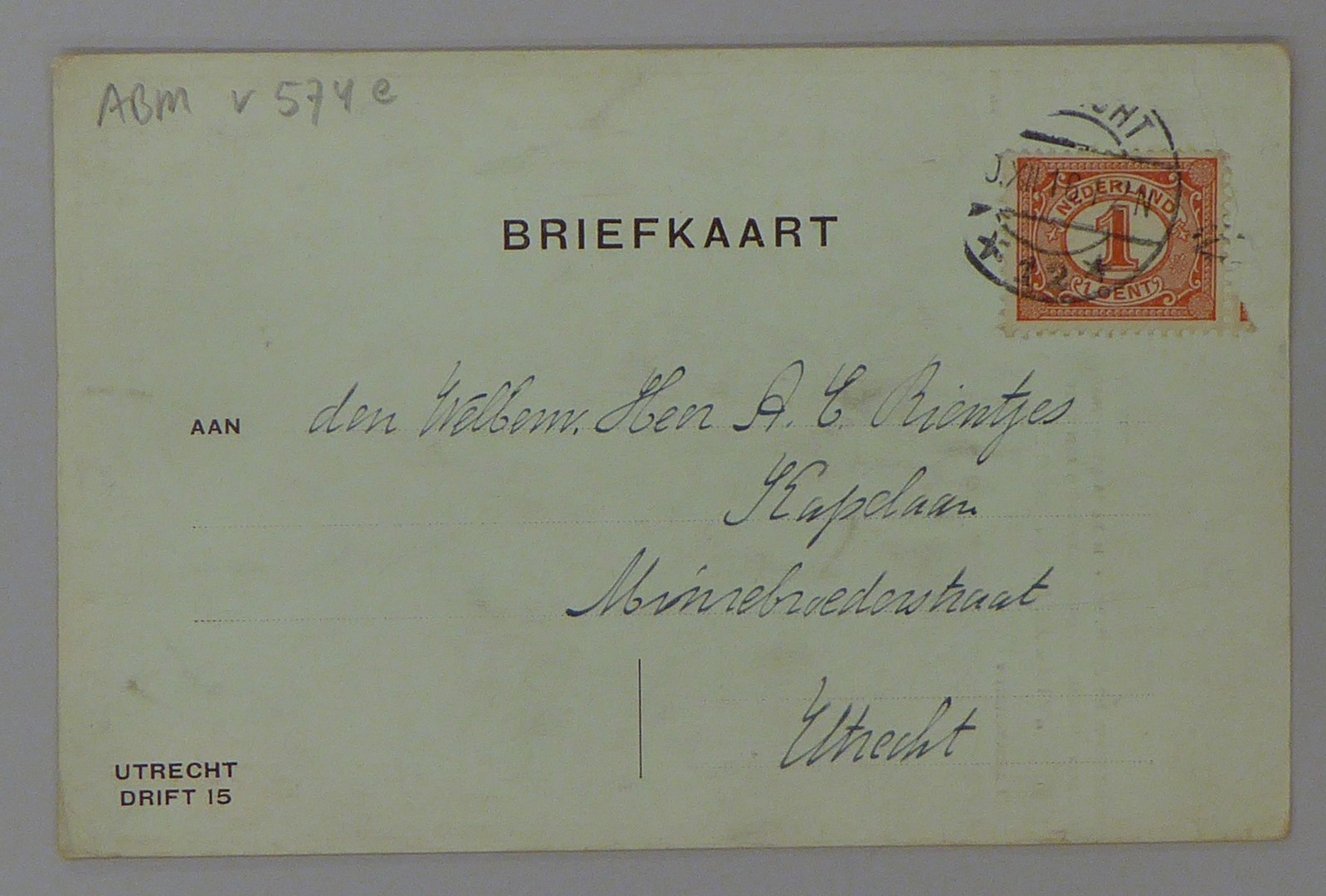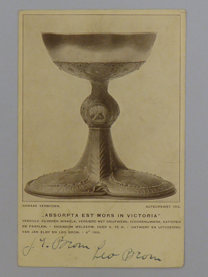 Prentbriefkaart met miskelk, "eigendom weleerw. heer V. te H.", van Jan Eloy en Leo Brom, gericht aan A.E. Rientjes (30 dec. 1916)