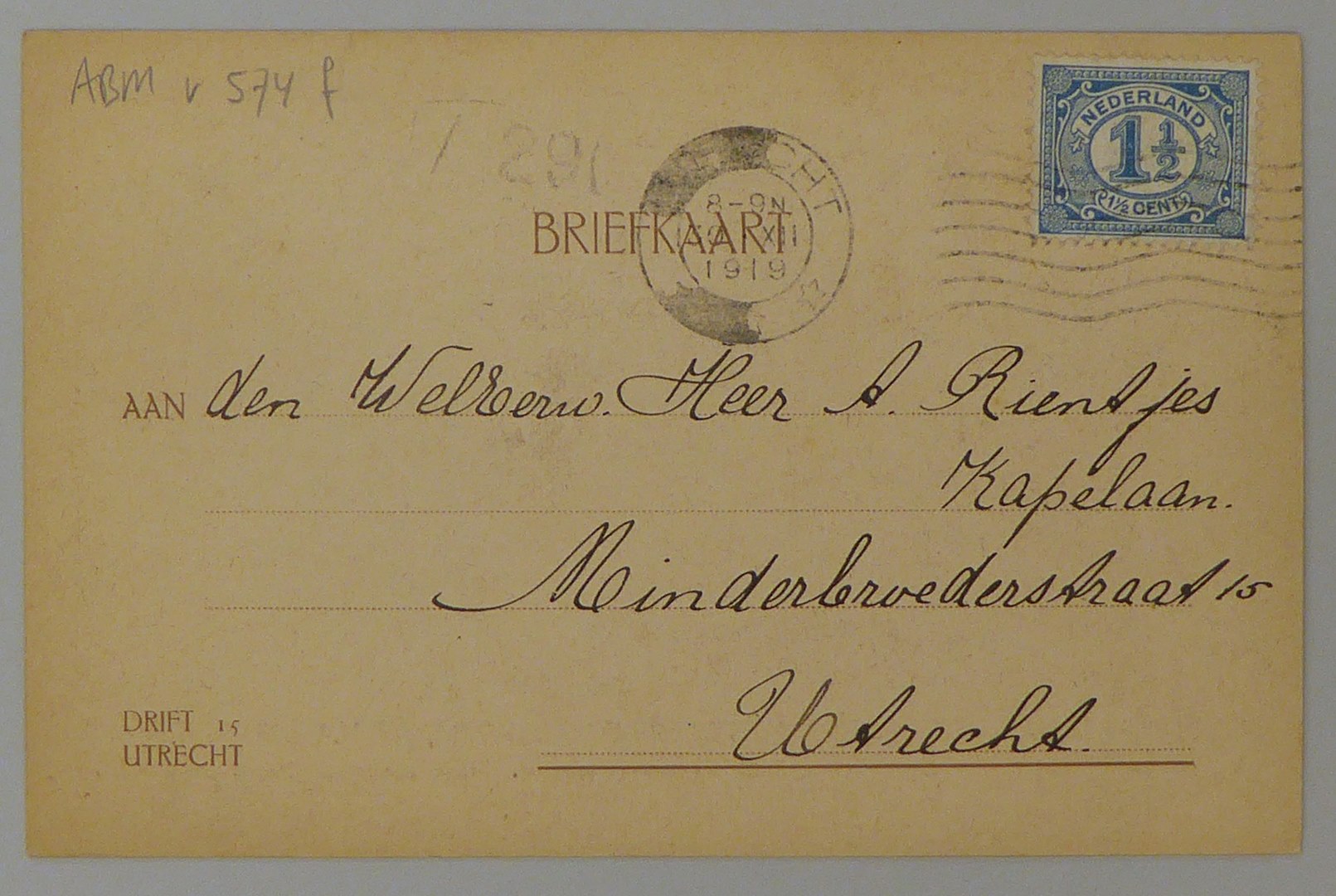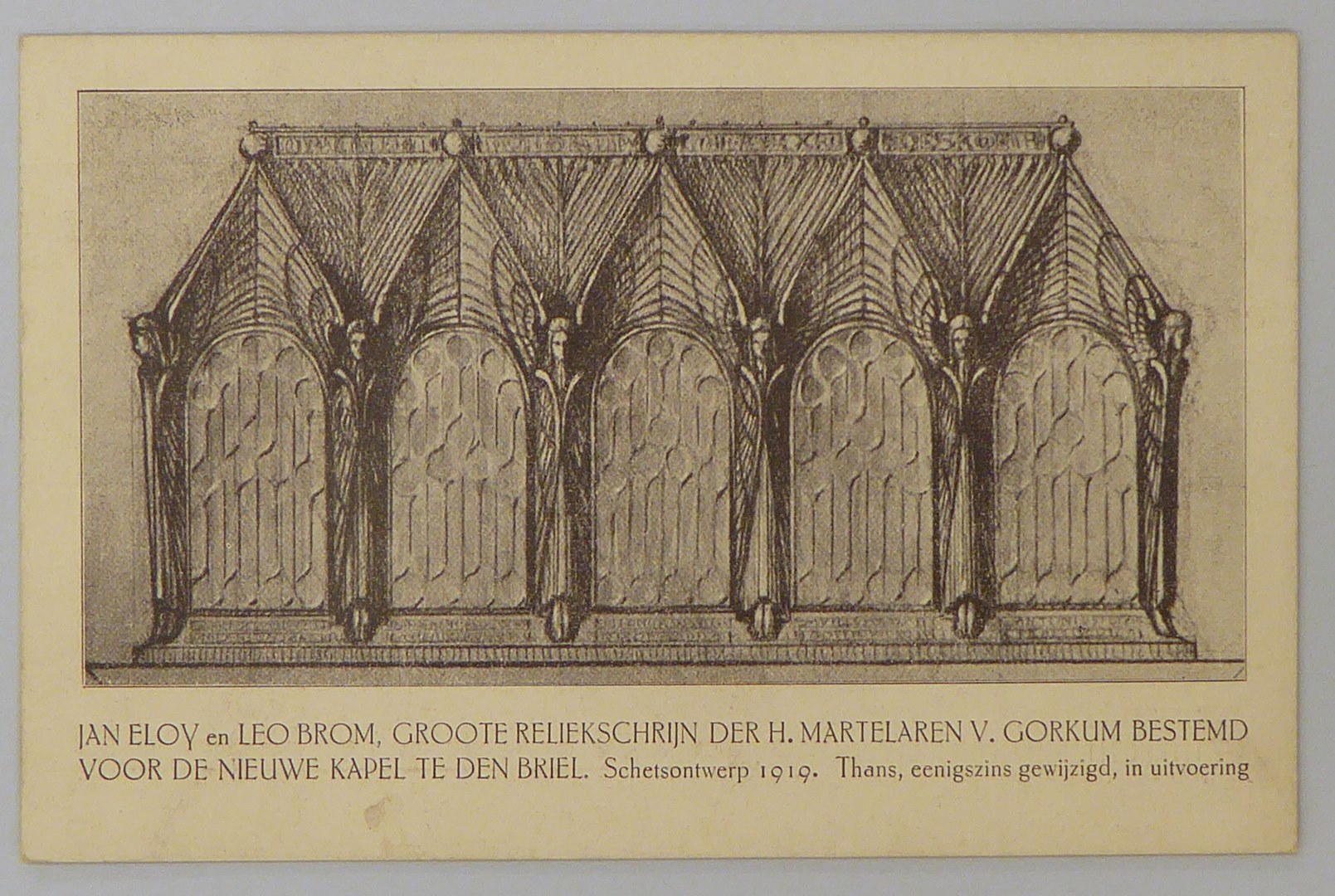 Prentbriefkaart met schetsontwerp reliekschrijn van de H. Martelaren van Gorkum te Den Briel van Jan Eloy en Leo Brom, gericht aan A.E. Rientjes (30 dec. 1919)