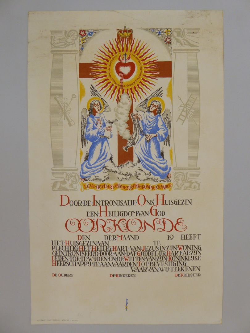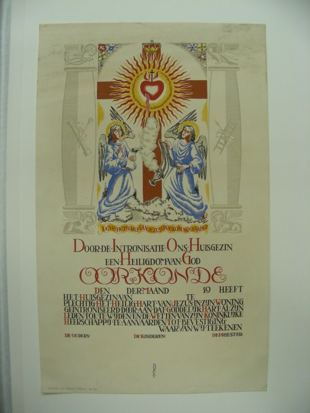 Oorkonde met twee engelen onder het kruis en "Door de Intronisatie Ons Huisgezin ..."