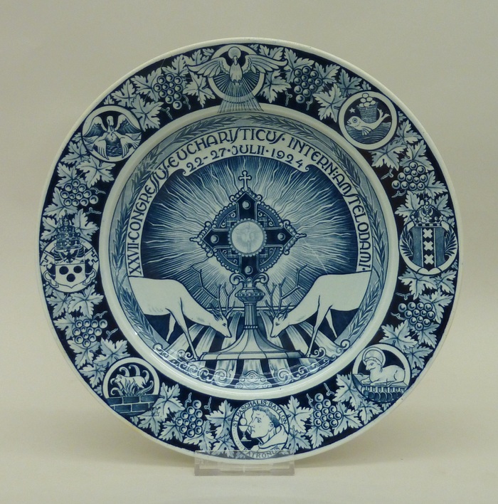 Bord van het Internationale Eucharistisch Congres (Amsterdam 1924) met monstrans en twee herten