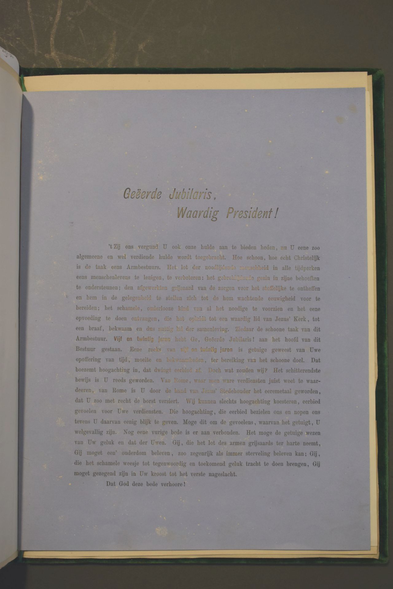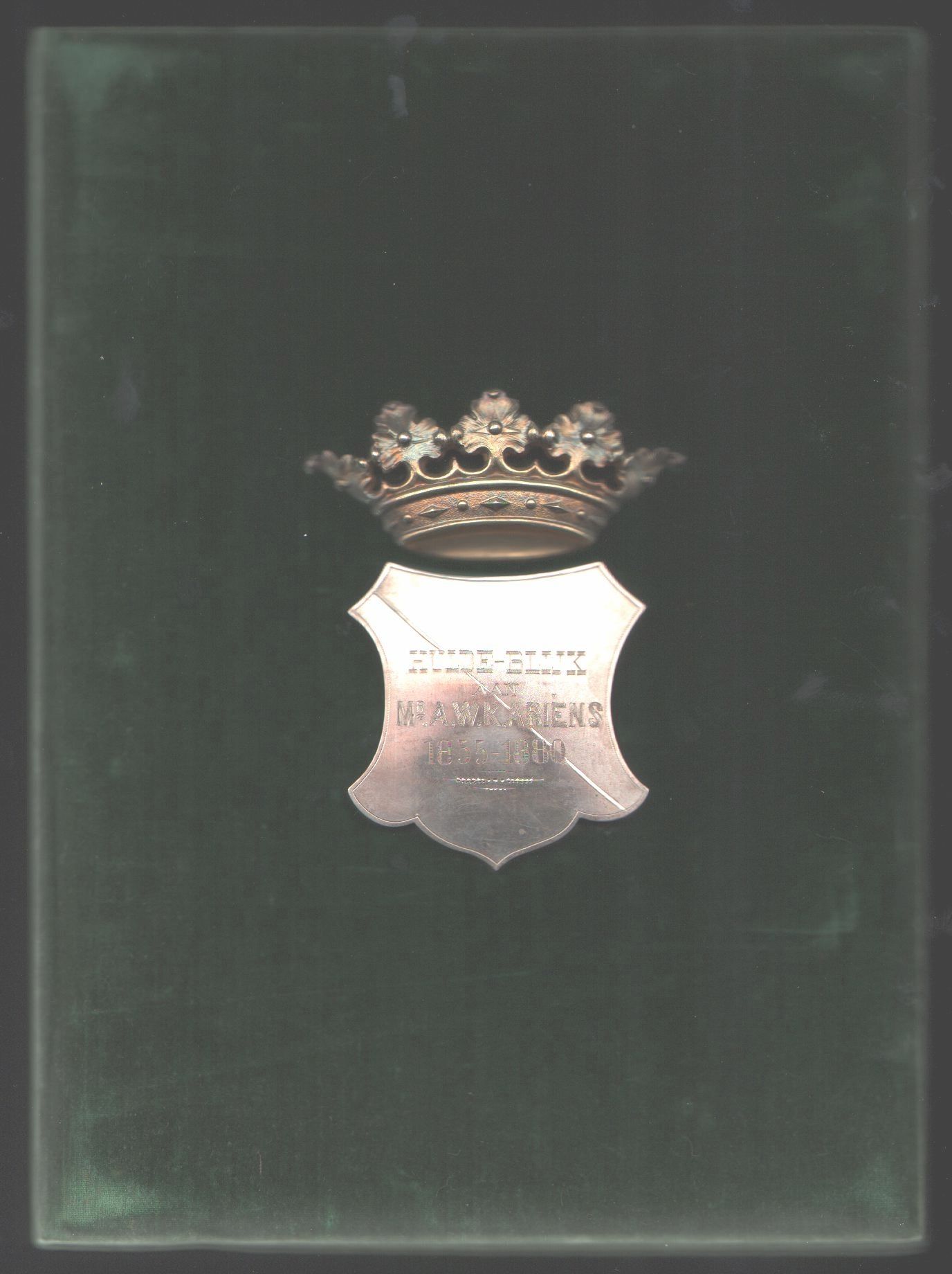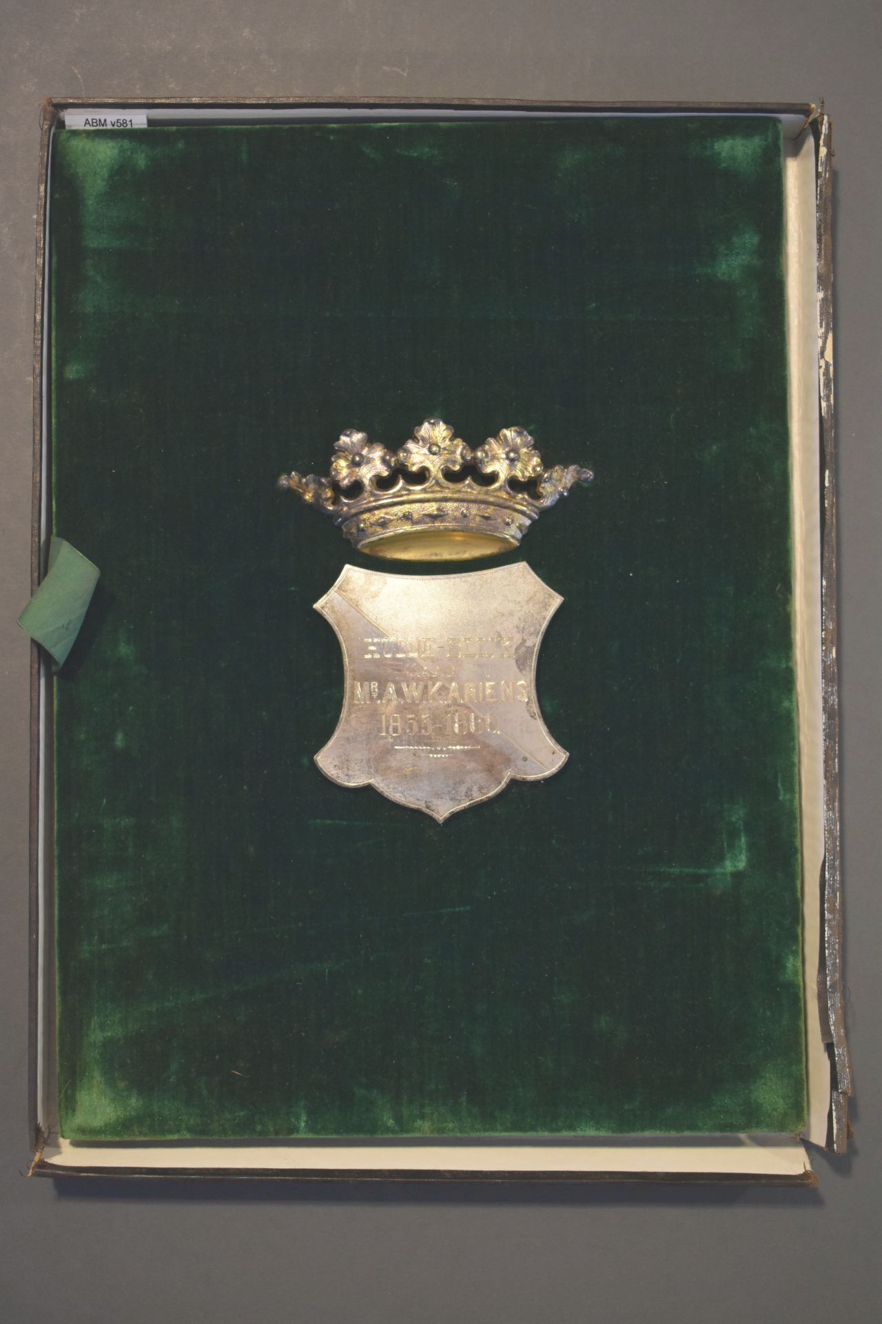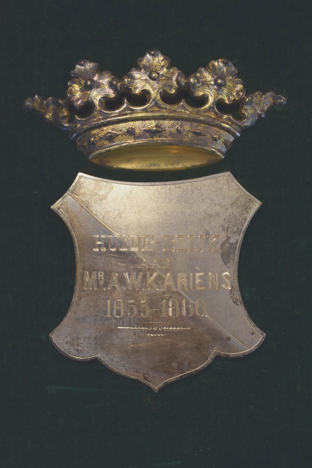 Groen fluwelen album met wapenschild met "Hulde-blijk Mr. A.W.K. Ariëns 1855-1880", waarin tekening en twee maal gedrukte tekst t.g.v. 25-jarig jubileum als president R.K. par. Armbestuur Utrecht