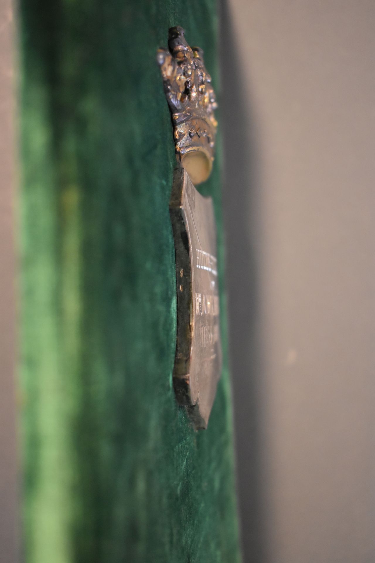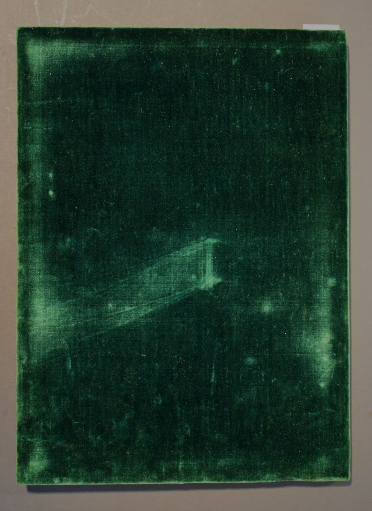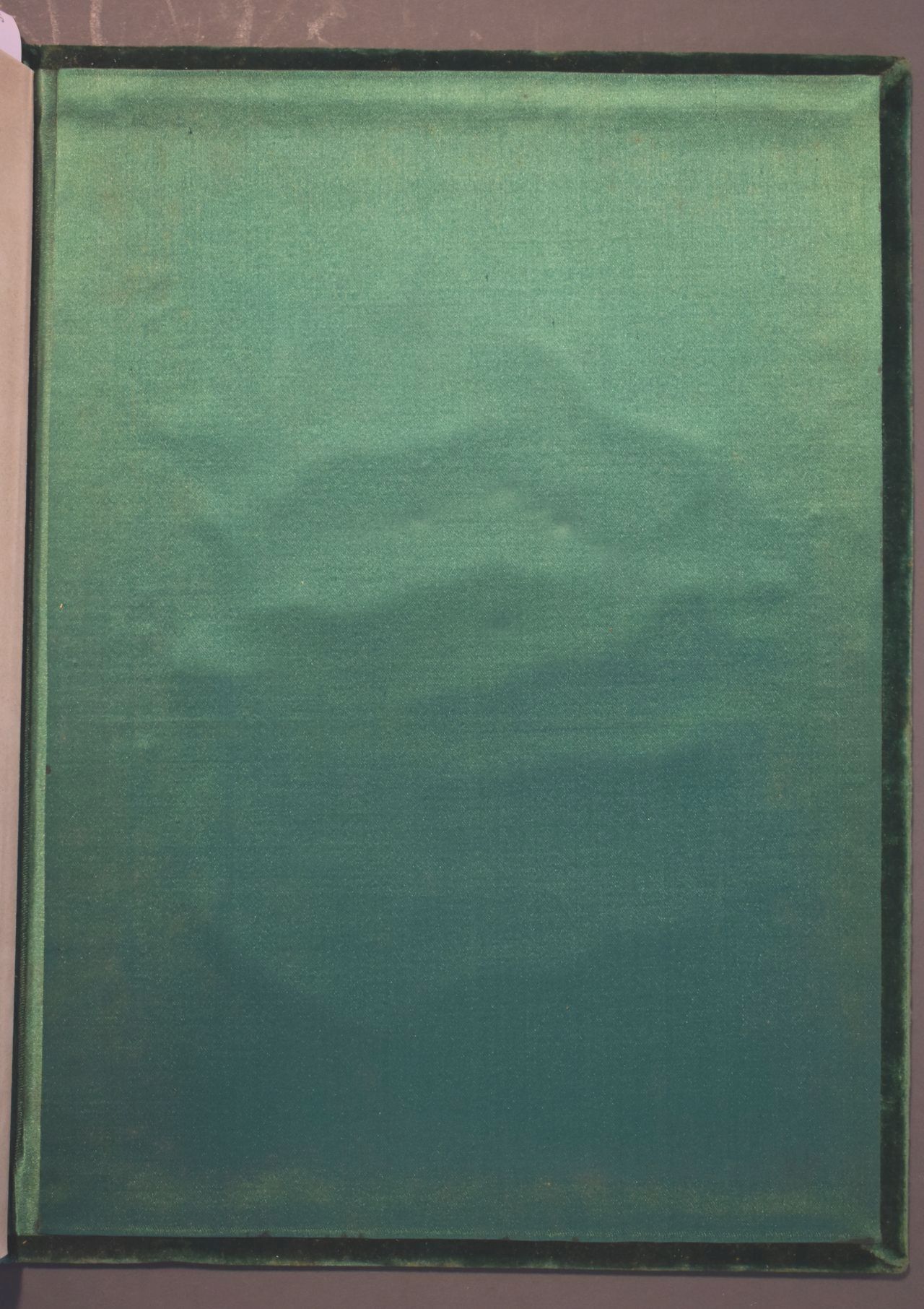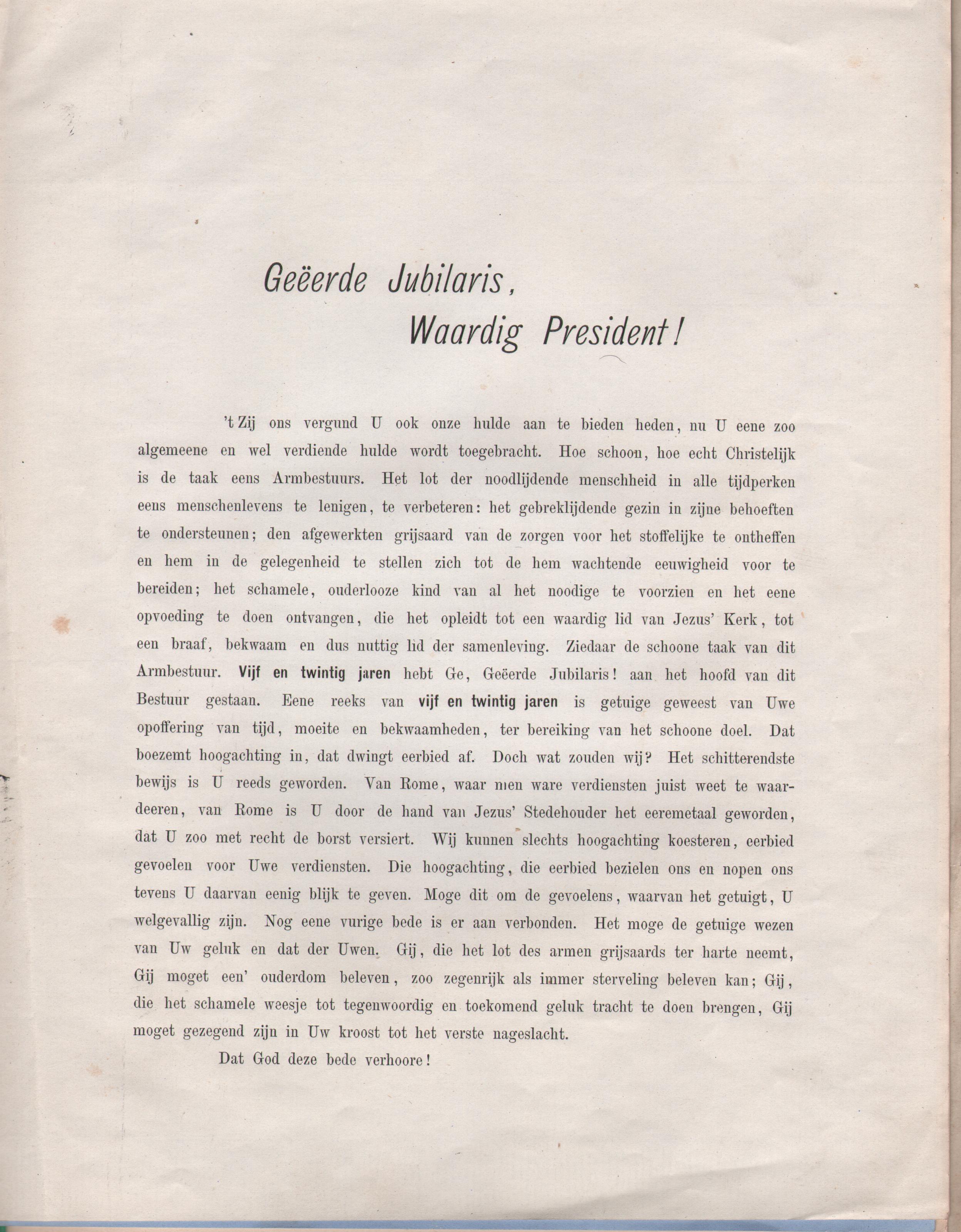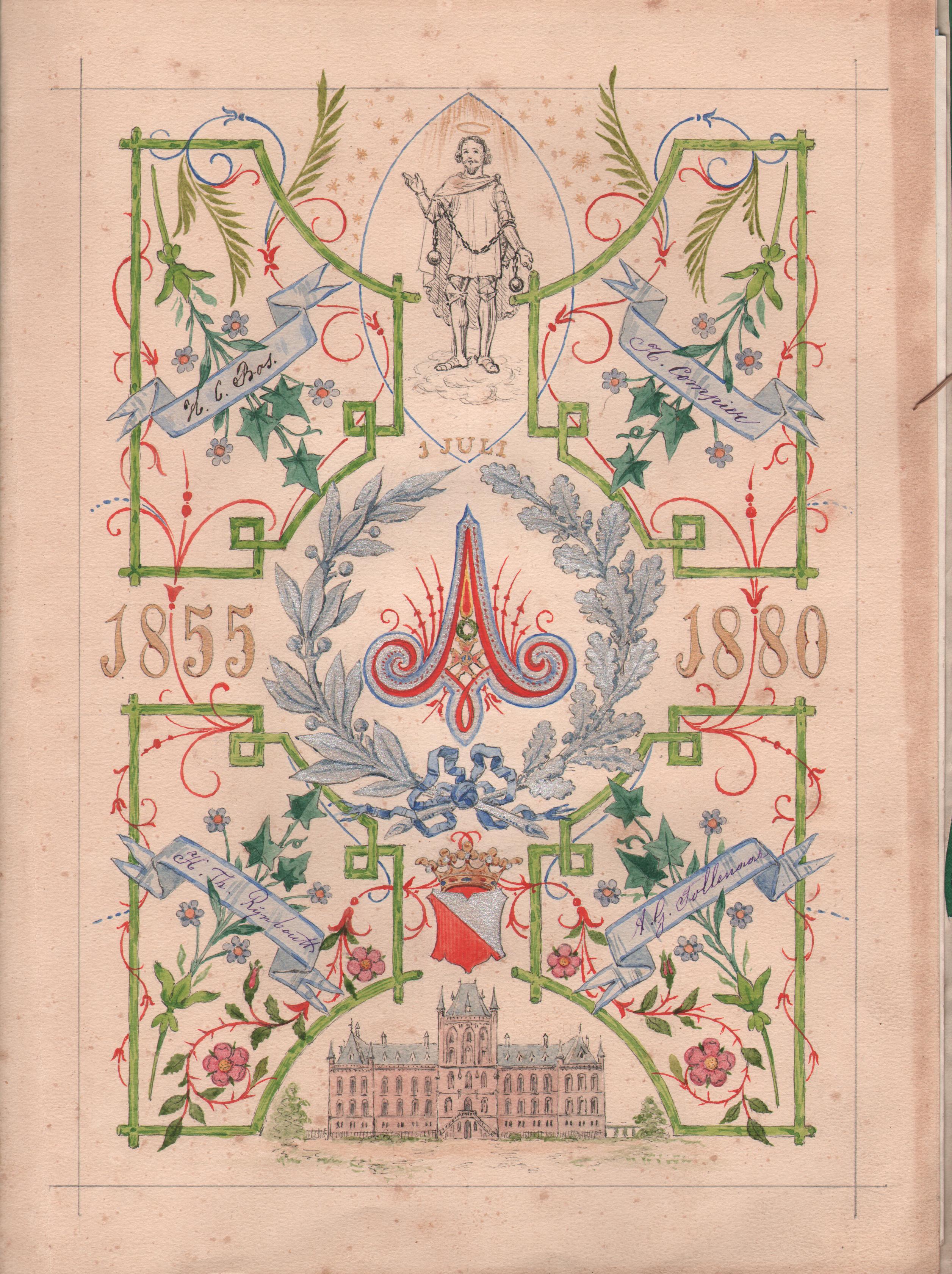 Groen fluwelen album met wapenschild met "Hulde-blijk Mr. A.W.K. Ariëns 1855-1880", waarin tekening en twee maal gedrukte tekst t.g.v. 25-jarig jubileum als president R.K. par. Armbestuur Utrecht