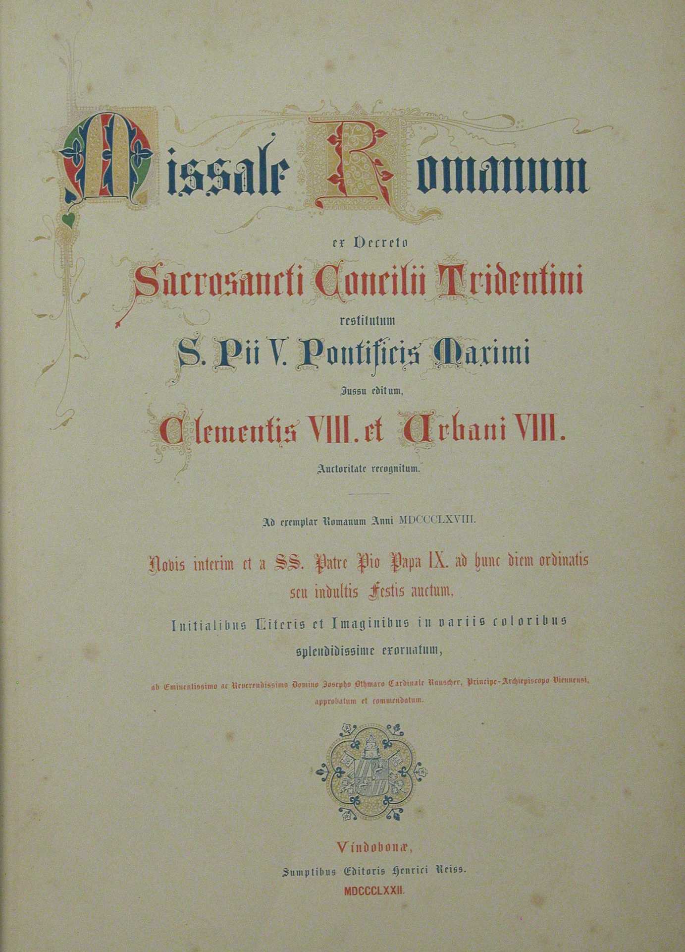 Missale Romanum ex decreto sacrosancti concilii Tridentini restitutum Pii V pontificis Maximi iussu editum, Clementis VIII. et Urbani VIII. Auctoritate recognitum. Ad exemplar Romanum anni MDCCCLXVIII.