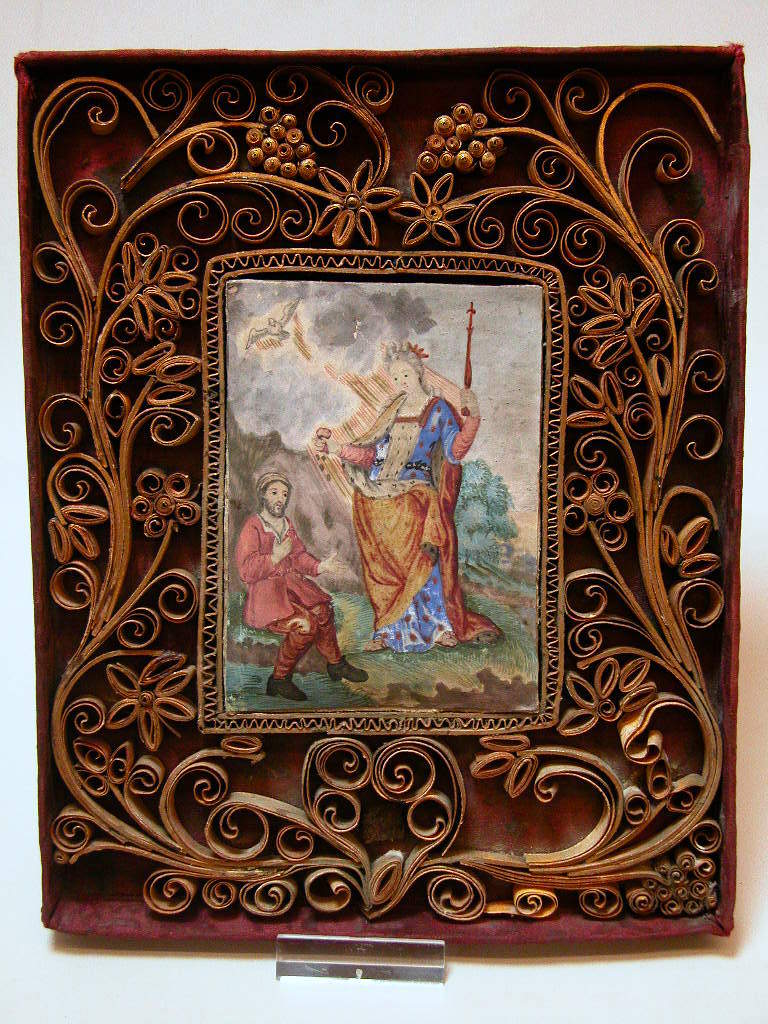 Doosje met ingekleurde afbeelding en textielreliek van H. Elisabeth met leliestaf in landschap, eromheen filigraanwerk