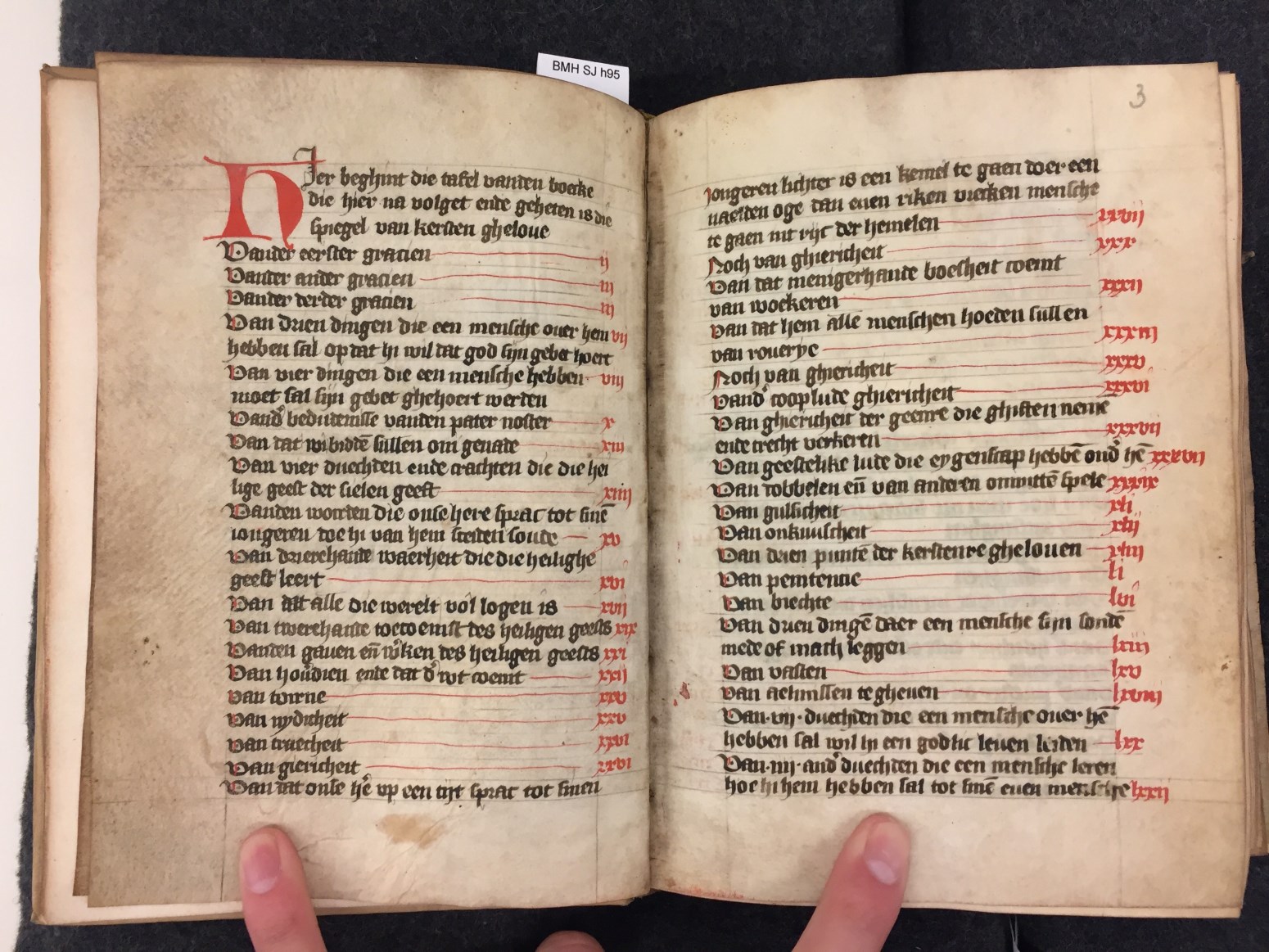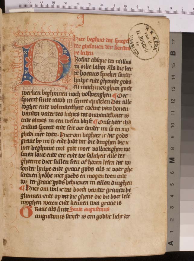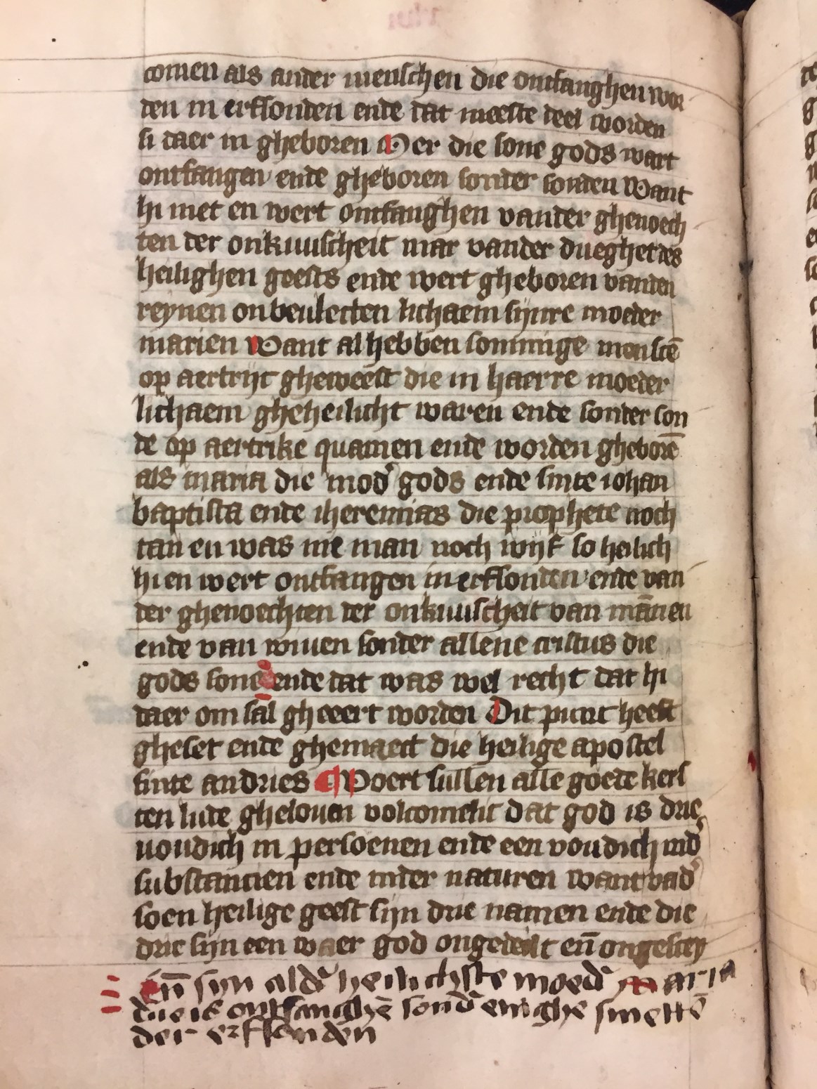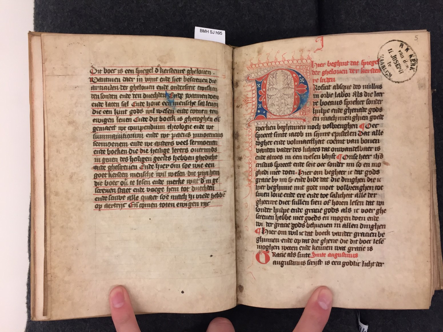 Een handschrift met de Spiegel der Kerstenre gheloven uit het midden van de 15de eeuw. Gumbert vermoedde dat het boek uit het Clarissen-klooster van Haarlem afkomstig was. De oudste eigendomgegevens zijn onleesbaar gemaakt. Wat ik opmaak uit de geraseerde tekst op f. 1v is: Dit bock van mijn susters ghesent ende behort Jan Konyn dochter ...
