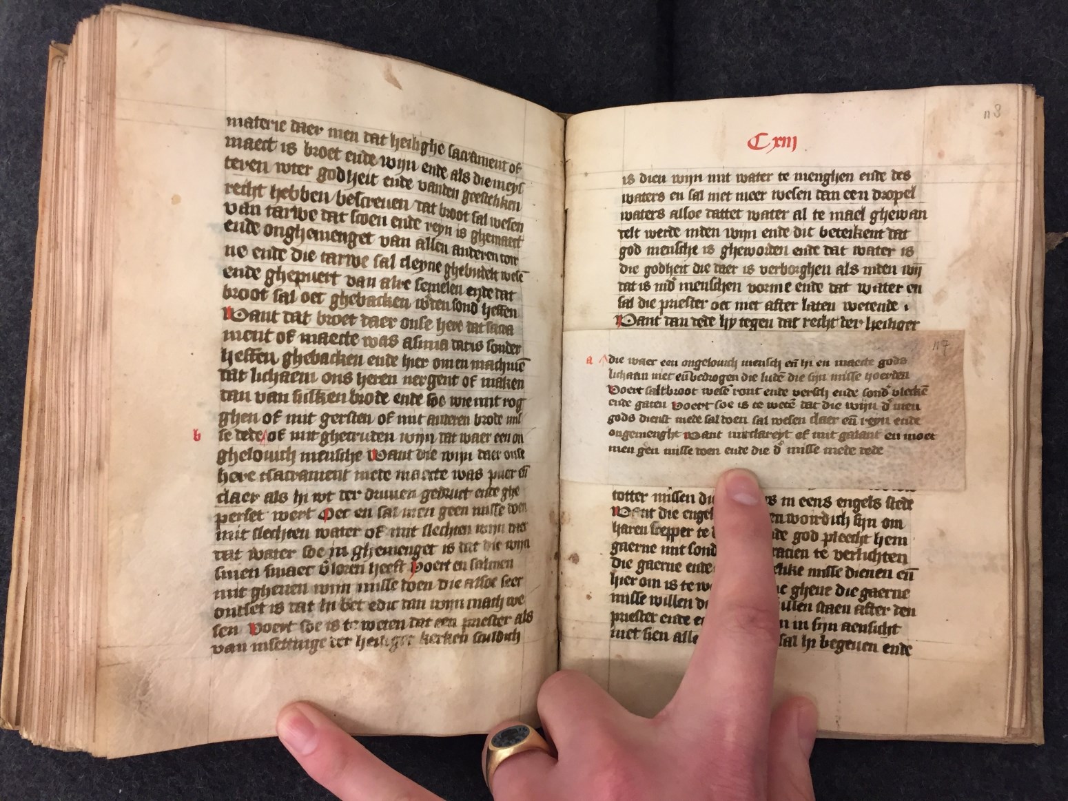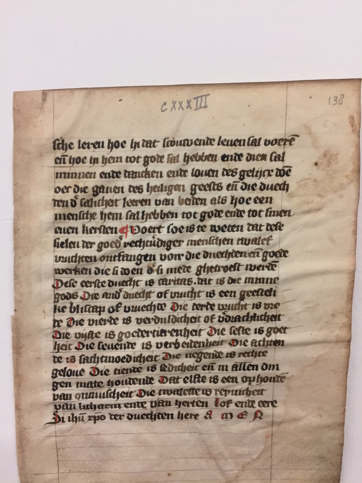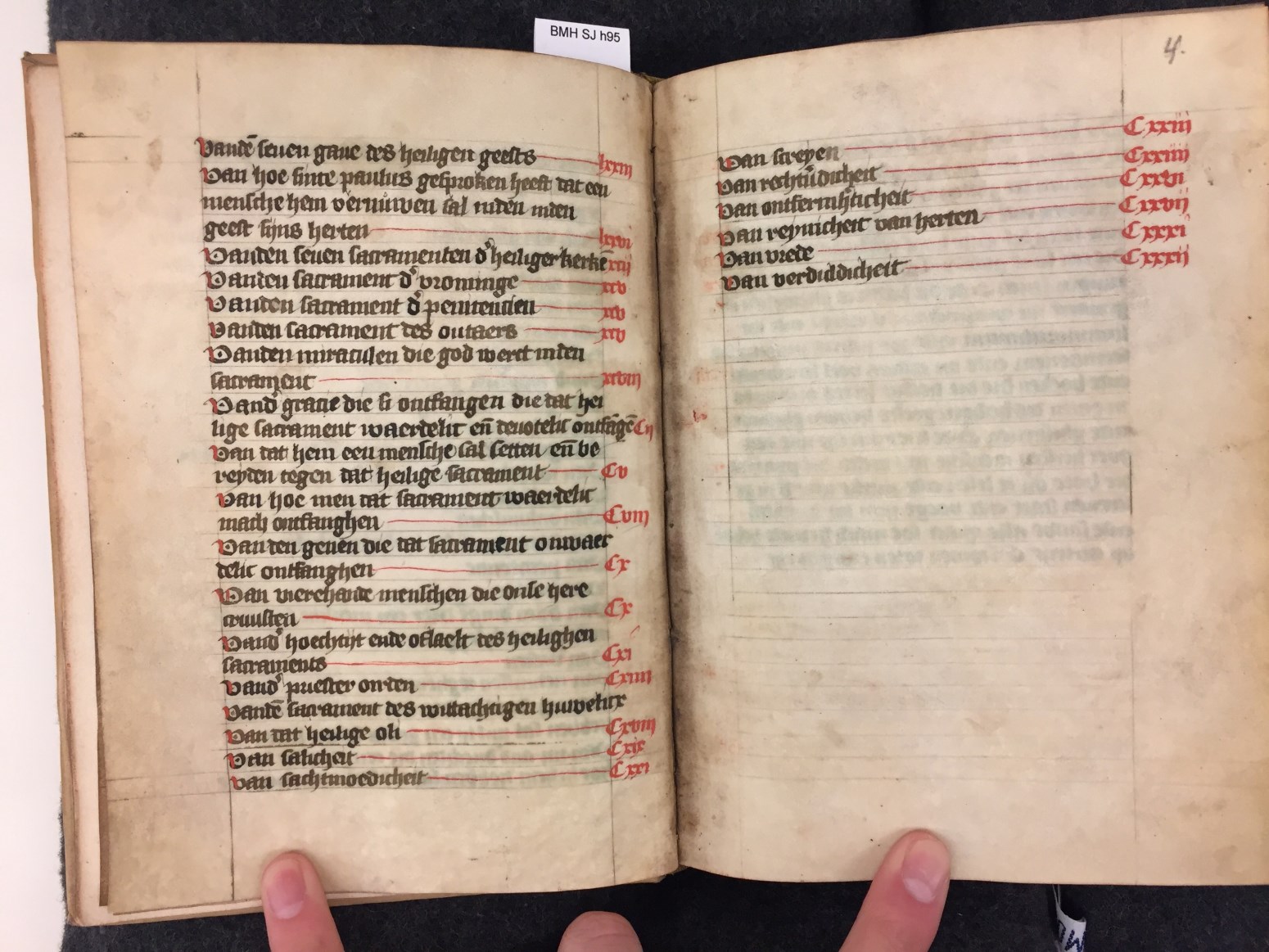 Een handschrift met de Spiegel der Kerstenre gheloven uit het midden van de 15de eeuw. Gumbert vermoedde dat het boek uit het Clarissen-klooster van Haarlem afkomstig was. De oudste eigendomgegevens zijn onleesbaar gemaakt. Wat ik opmaak uit de geraseerde tekst op f. 1v is: Dit bock van mijn susters ghesent ende behort Jan Konyn dochter ...