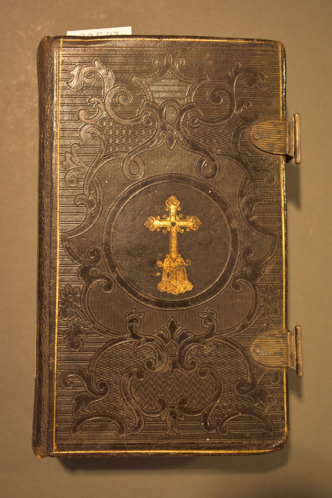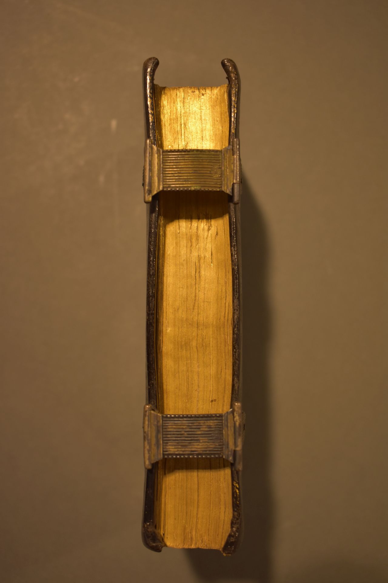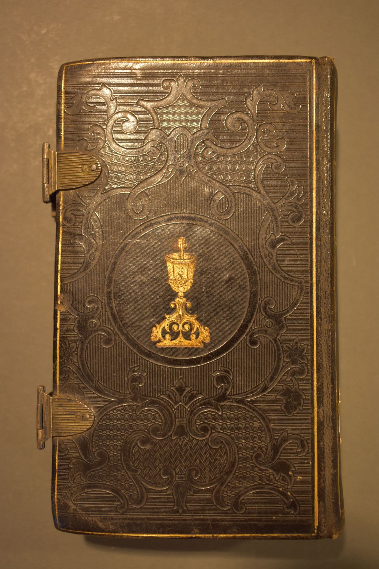 Voorste afbeelding in het boek door Ledoyen te Parijs. De zwarte leren band is versierd met een blinde plaatstempel bestaande uit krullen en horizontale lijnen met in het midden een dubbele cirkel. Hier over heen zit een enkellijnkader van bladgoud en in de cirkel een kruis van bladgoud op het voorplat en een kelk op ...