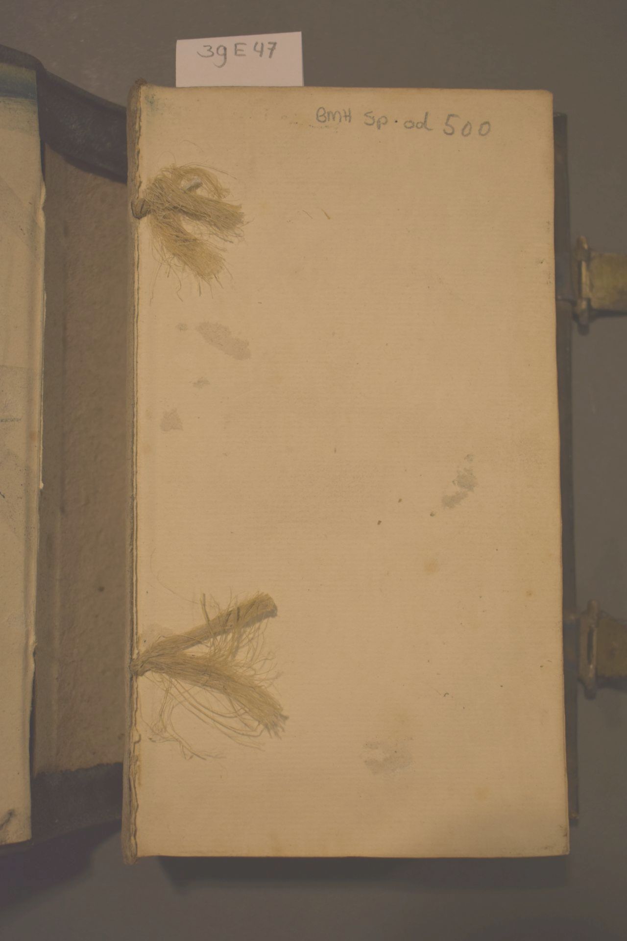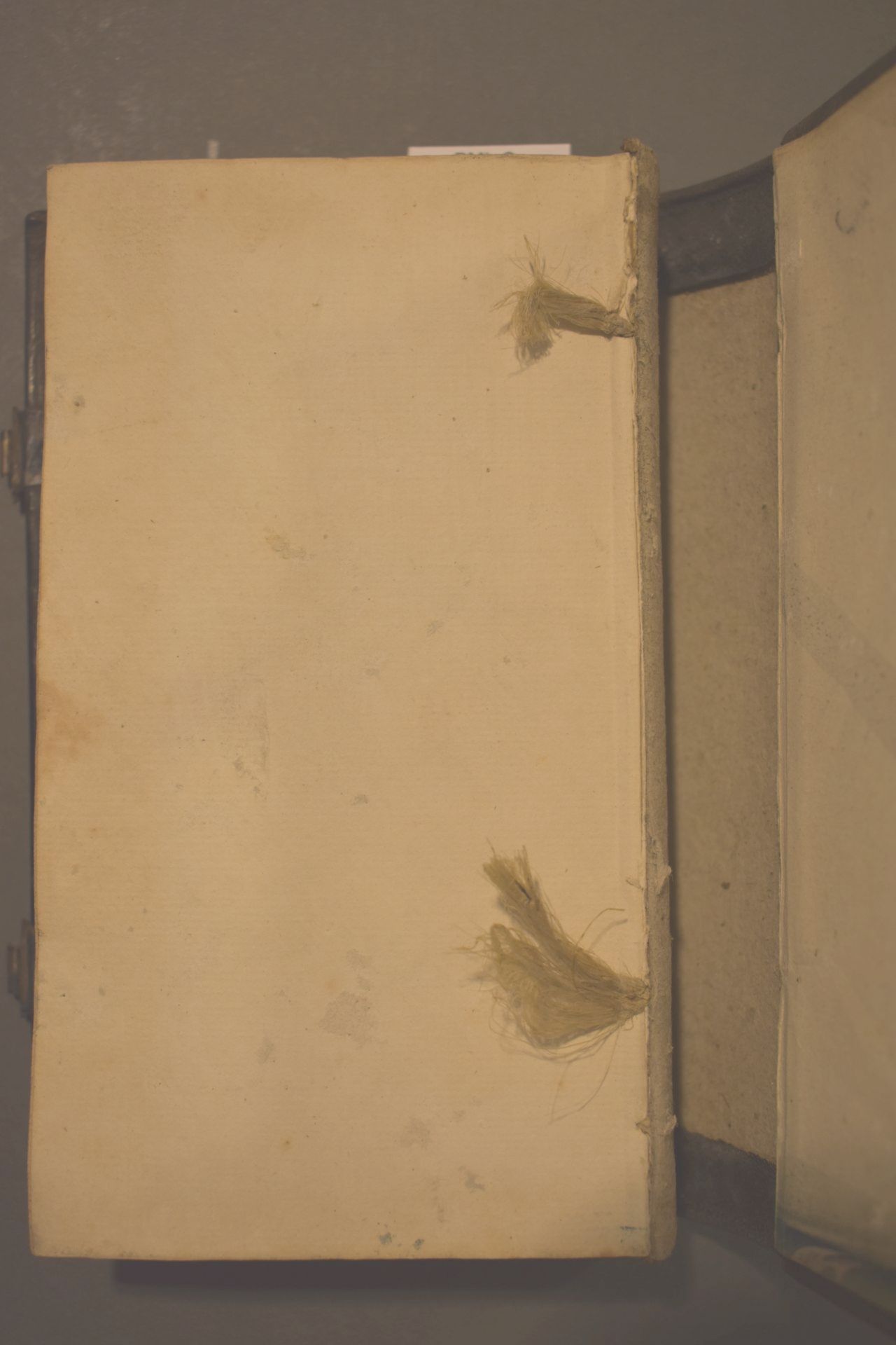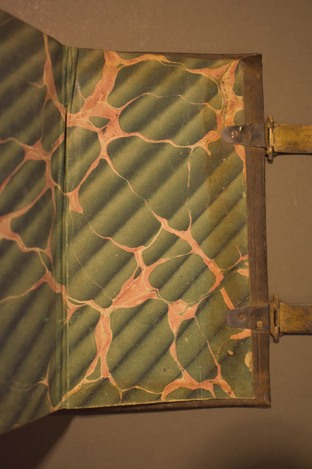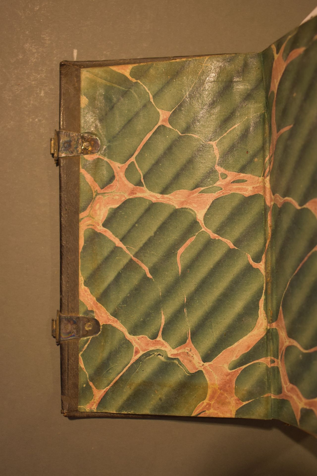 Voorste afbeelding in het boek door Ledoyen te Parijs. De zwarte leren band is versierd met een blinde plaatstempel bestaande uit krullen en horizontale lijnen met in het midden een dubbele cirkel. Hier over heen zit een enkellijnkader van bladgoud en in de cirkel een kruis van bladgoud op het voorplat en een kelk op ...