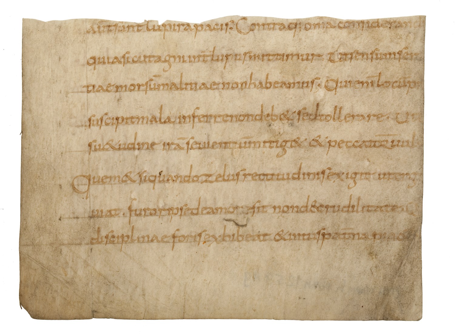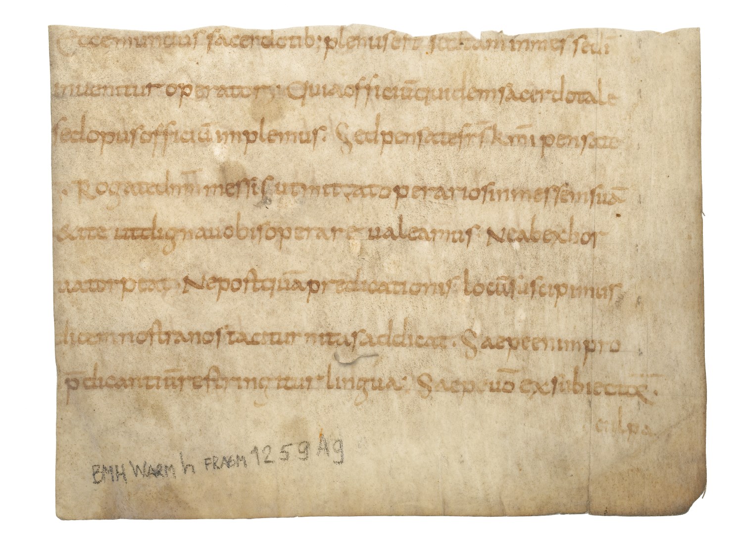 Dit kleine fragment geeft aan weerszijden twee keer acht regels tekst uit de eerste van veertig homilieën van paus Gregorius de Grote. De regels zijn blind gelinieerd met behulp van gaatjes die voor elke regel in de marge geprikt zijn. De woorden zijn in een duidelijke Karolingische minuskel geschreven, maar nog in scriptura continua (aan ...