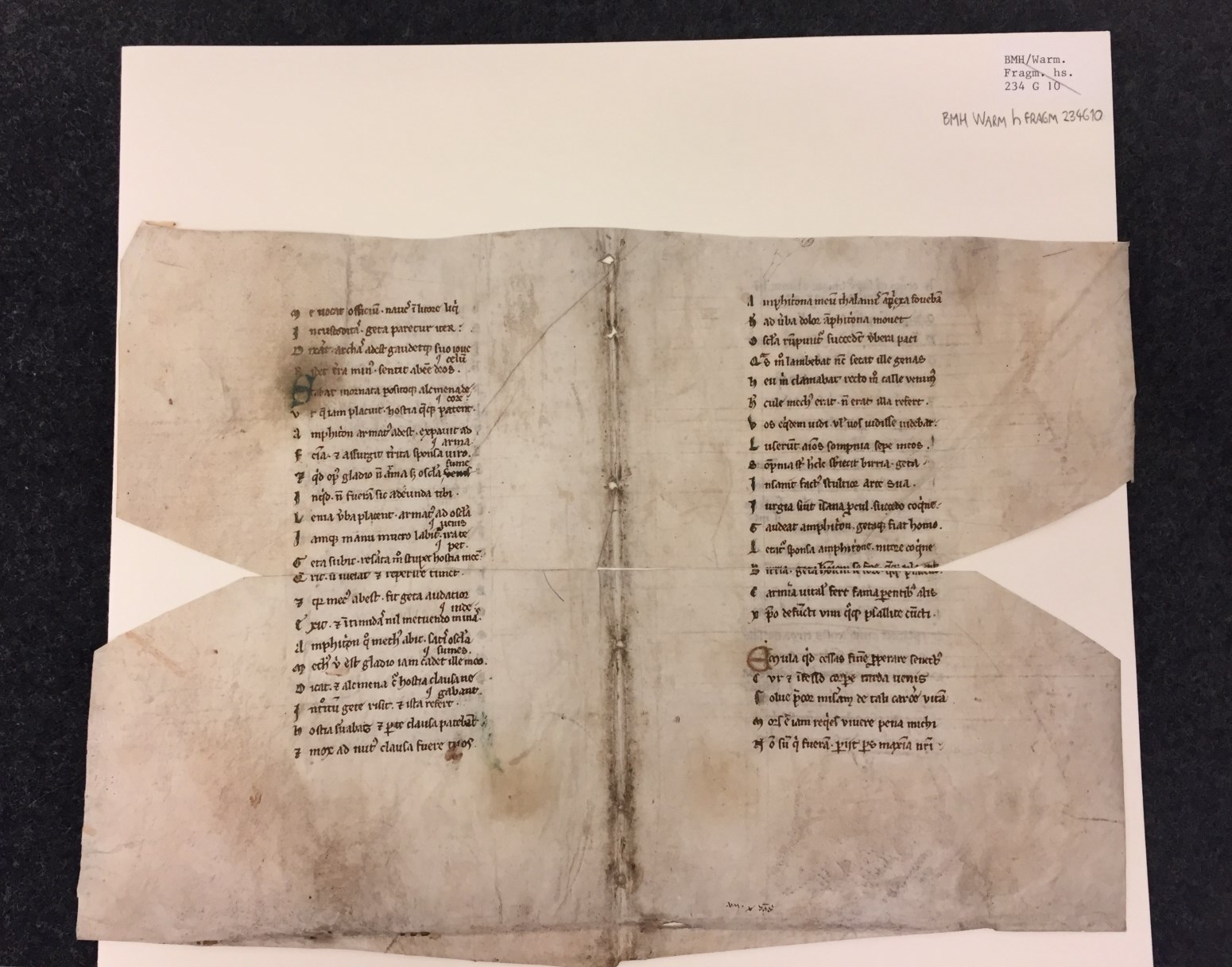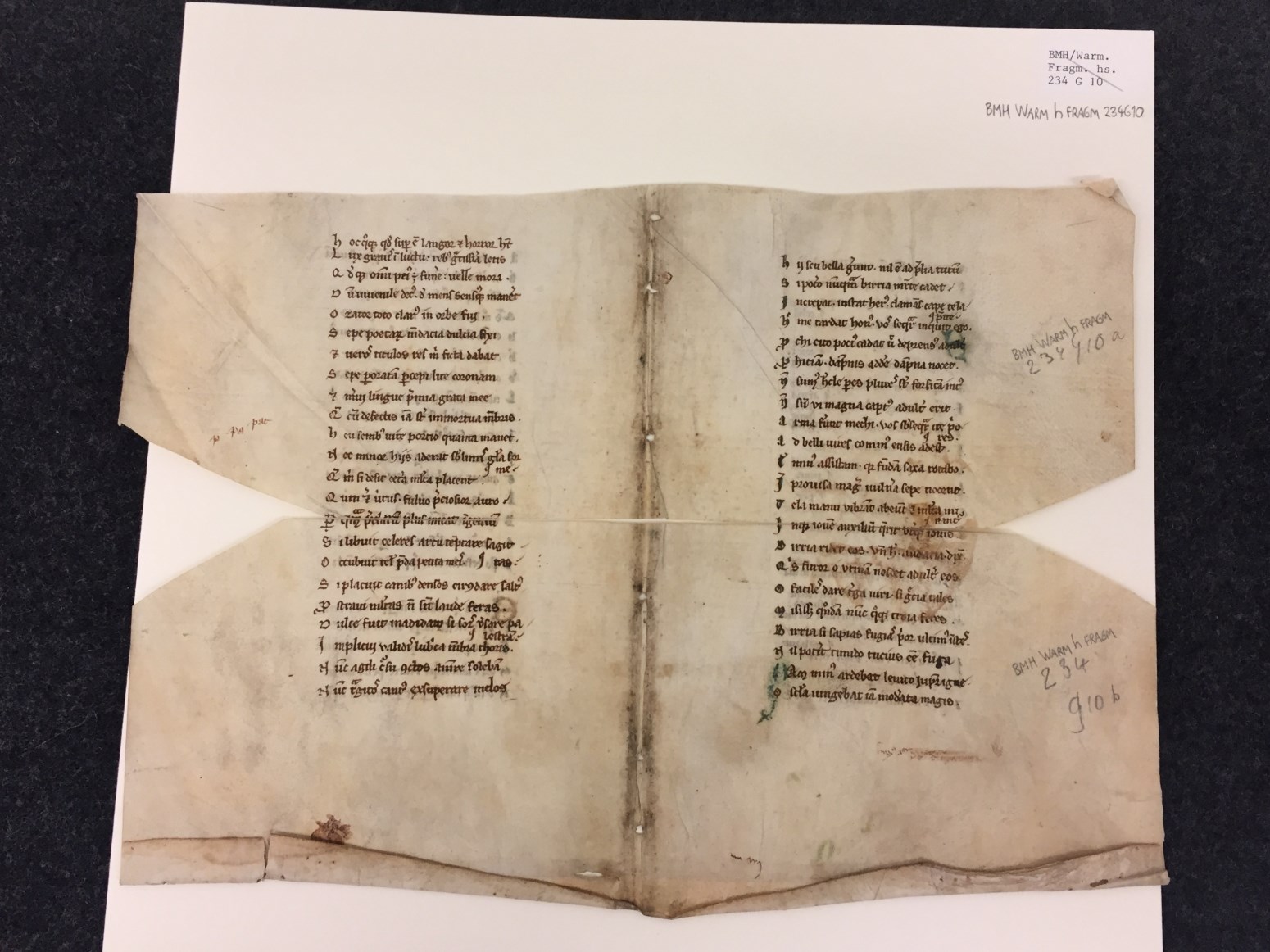 Fragmenten, 2 stuks, aanelkaar passend, r. Geta [vs. 473-530] en v. Elegiae [vs. 1-28]