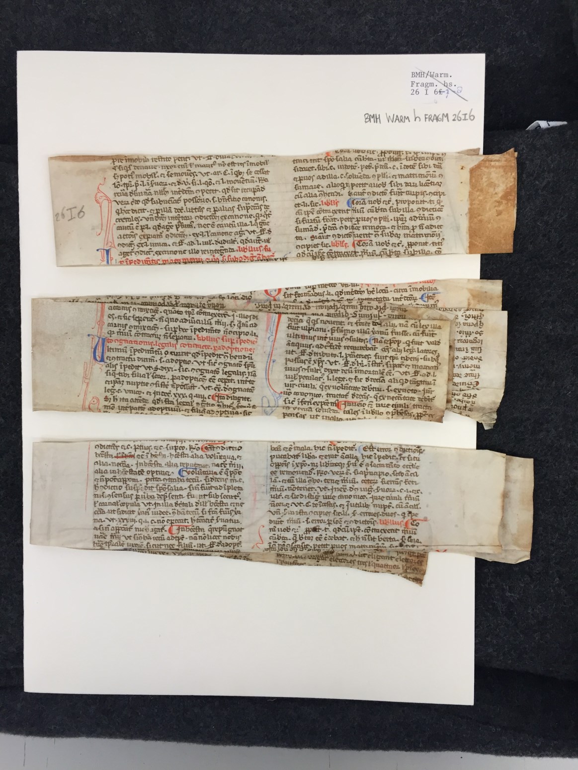 De blaadjes, die als versteviging in een band hebben gezeten, zijn uit twee dubbelbladen gesneden. Vier strookjes zijn aan elkaar te leggen waarbij alleen tussen de eerste strookjes enkele regels tekst verloren zijn gegaan. Twee andere strookjes behoren tot een tweede dubbelblad. De tekst is afkomstig uit de Libelli van het canoniek recht van Roffredus ...