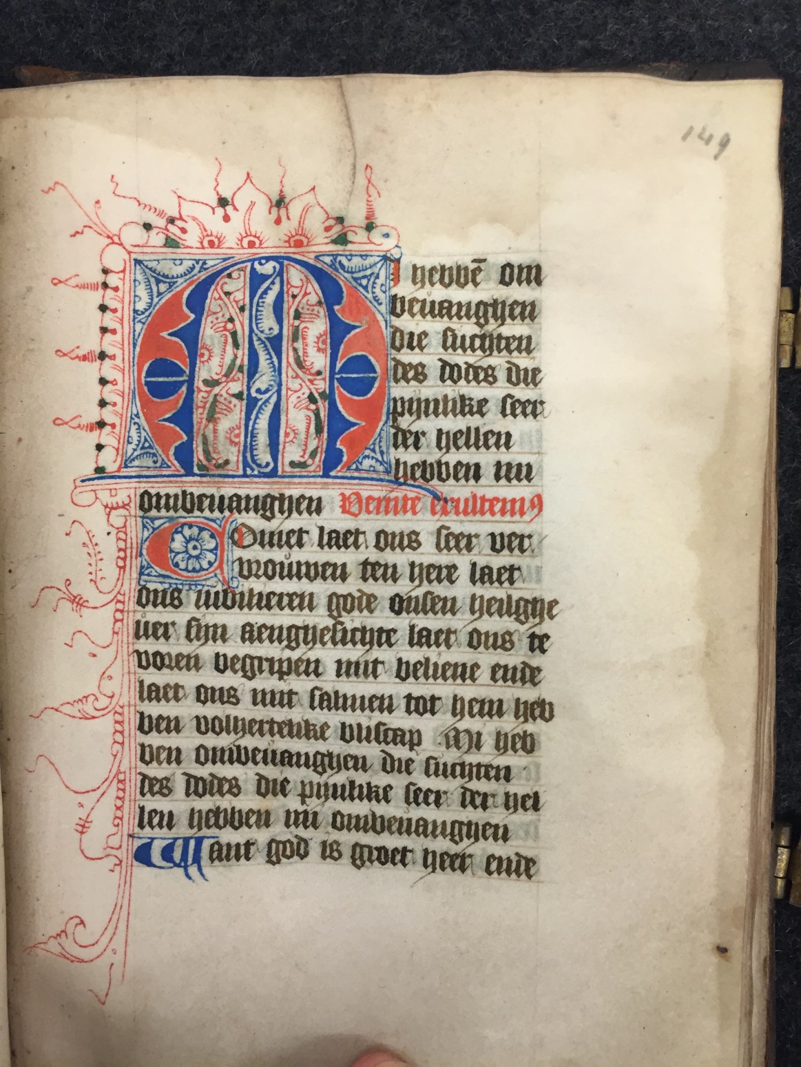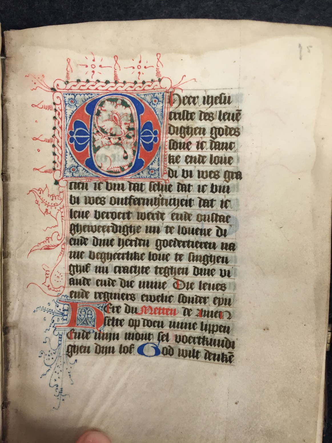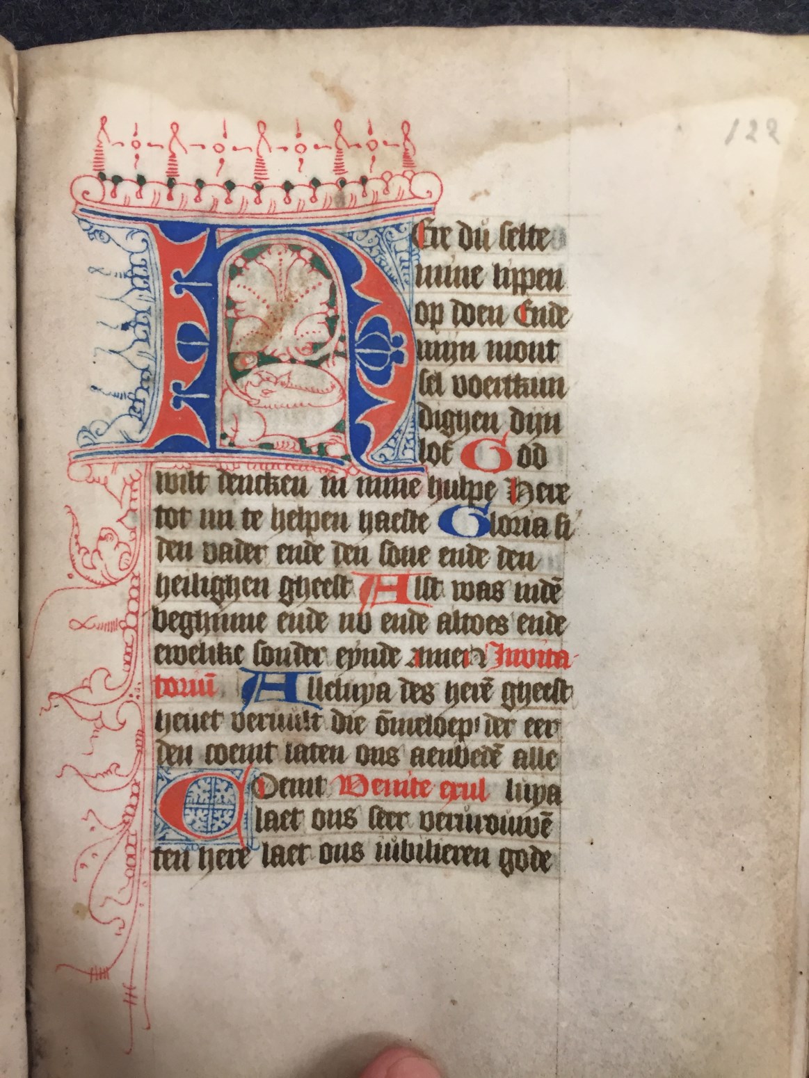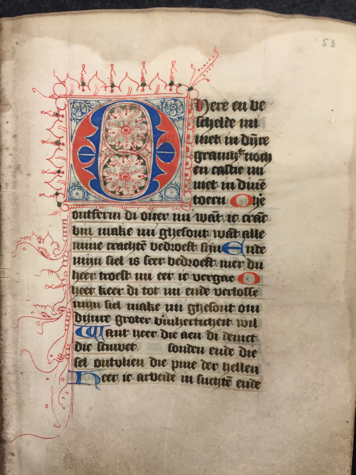 Het handschrift bevat geen miniaturen, maar is een typisch voorbeeld van een handschrift met Utrechtse penwerkversiering. In Utrecht zijn veel handschriften versierd waarin in de initiaal een veelal vrolijk kijkend draakje zit, met lange nek; uit zijn bek ontspringt vaak een stengel met blaadjes van verschillende grootte. Soms komt het diertje te voorschijn uit een ...