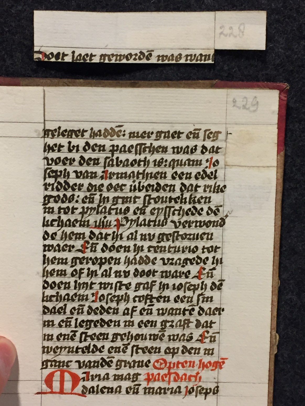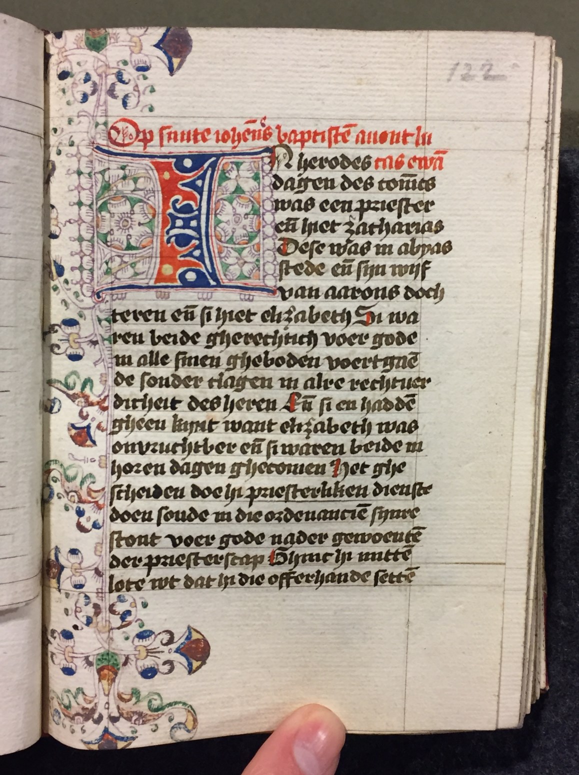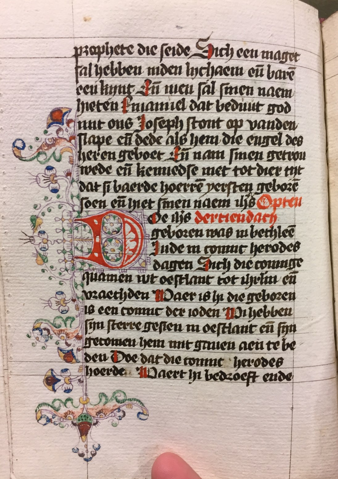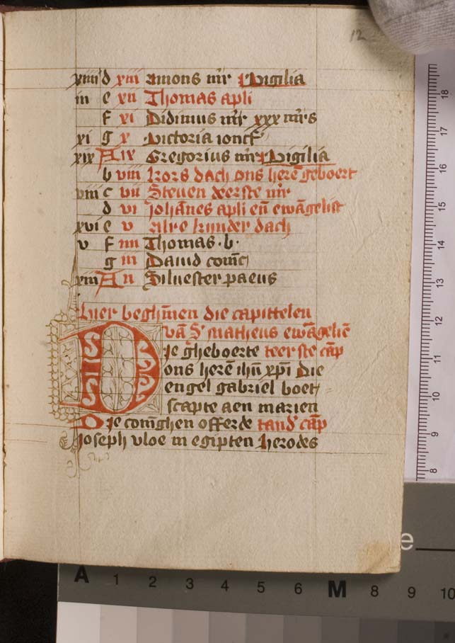 Handschrift met fragmenten van de Synoptische Evangeliën (Matteüs: incompleet, Lucas en het slot van Marcus) uit de Noordelijke-Nederlanden. Gumbert pleitte voor een datering in de tweede helft van de 15de eeuw. De tekst wordt vooraf gegaan door een kalender (f. 1r-18v), in het voetwit op het eerste blad vinden we de naam van zuster Maartje ...