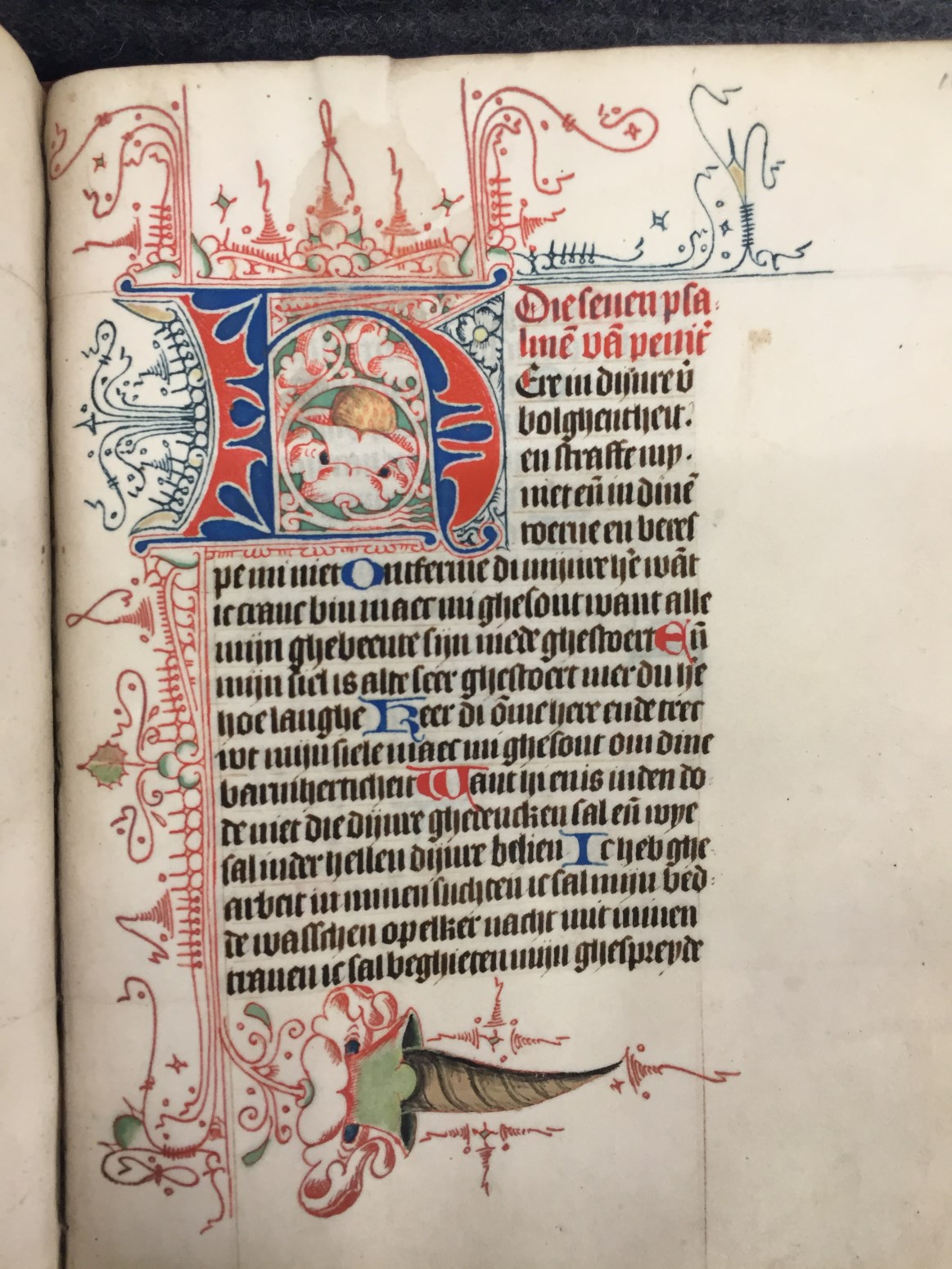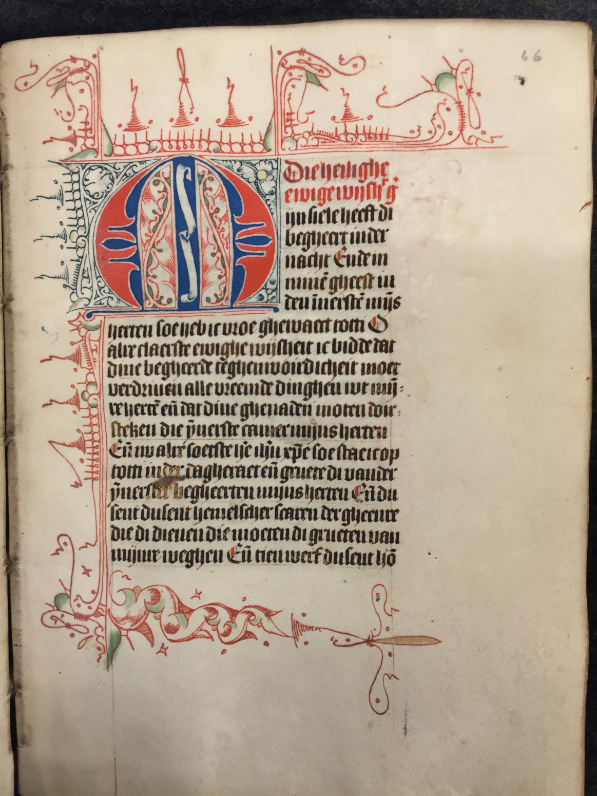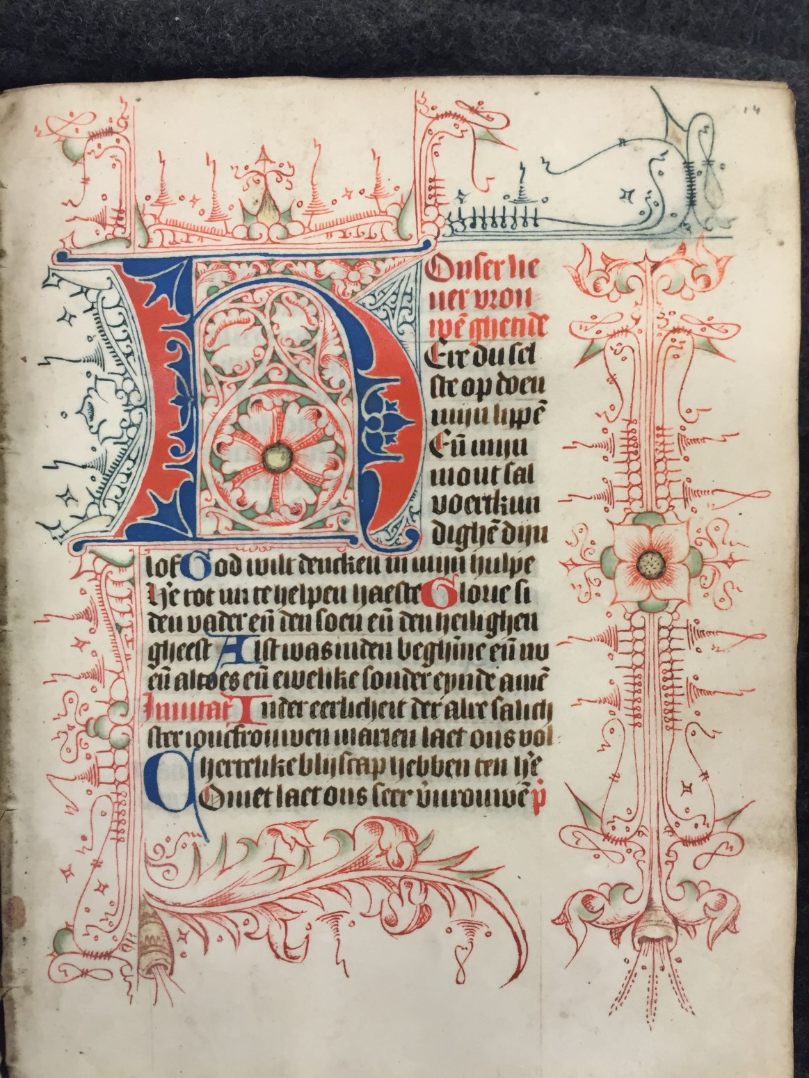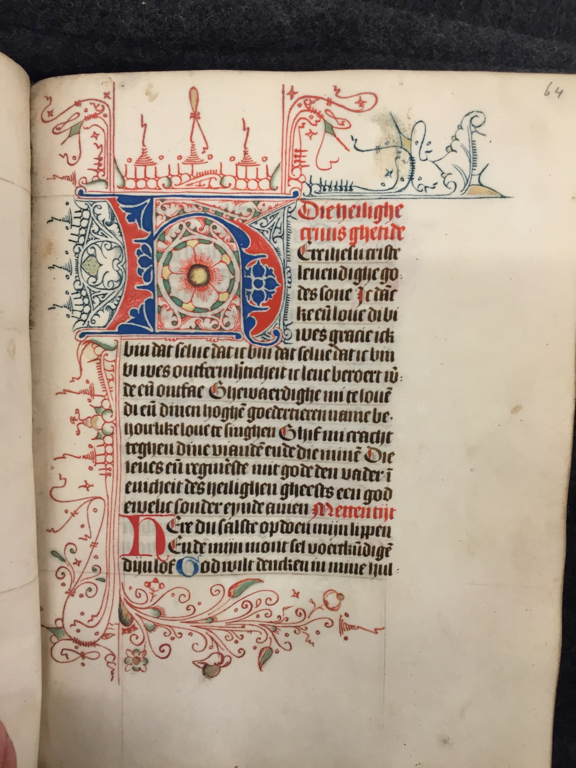 Bij het begin van een nieuwe hoofdtekst zien we zeer kunstig uitgewerkt Noord-Hollands penwerk, dat zich over vier marges uitspreidt, bij nieuwe hoofdstukken is de versiering eenvoudiger. Een bekend type is het Noordhollandse `doornen en steekjes' (of `prikkeldraad')-penwerk, waarin soms `maskertjes' of `tronies' verwerkt zijn. De grootste initialen, die de getijden openen, zijn in rood ...