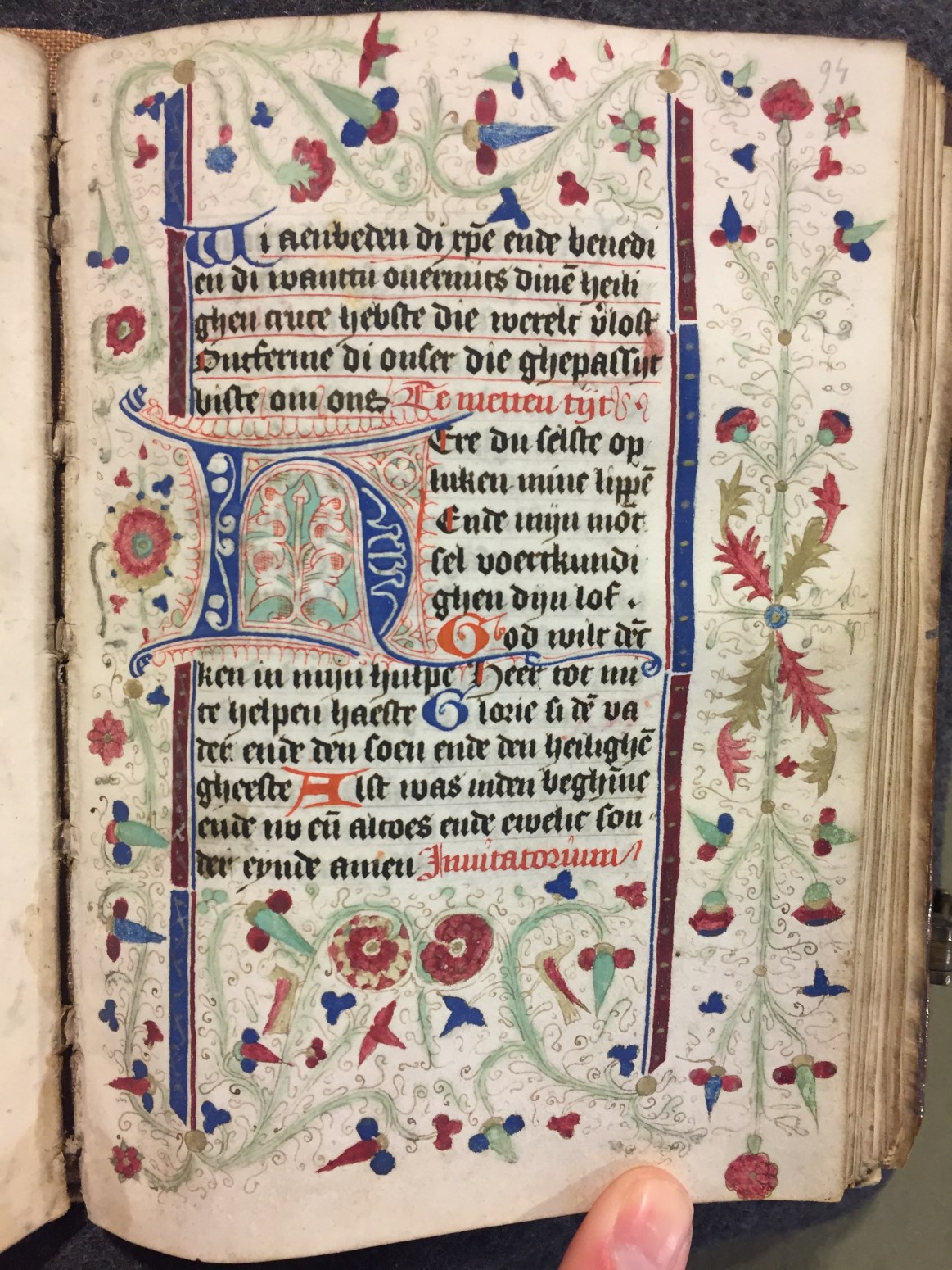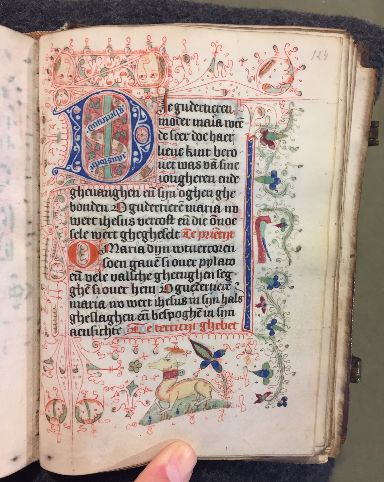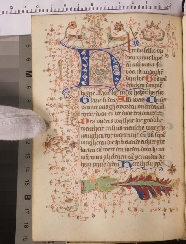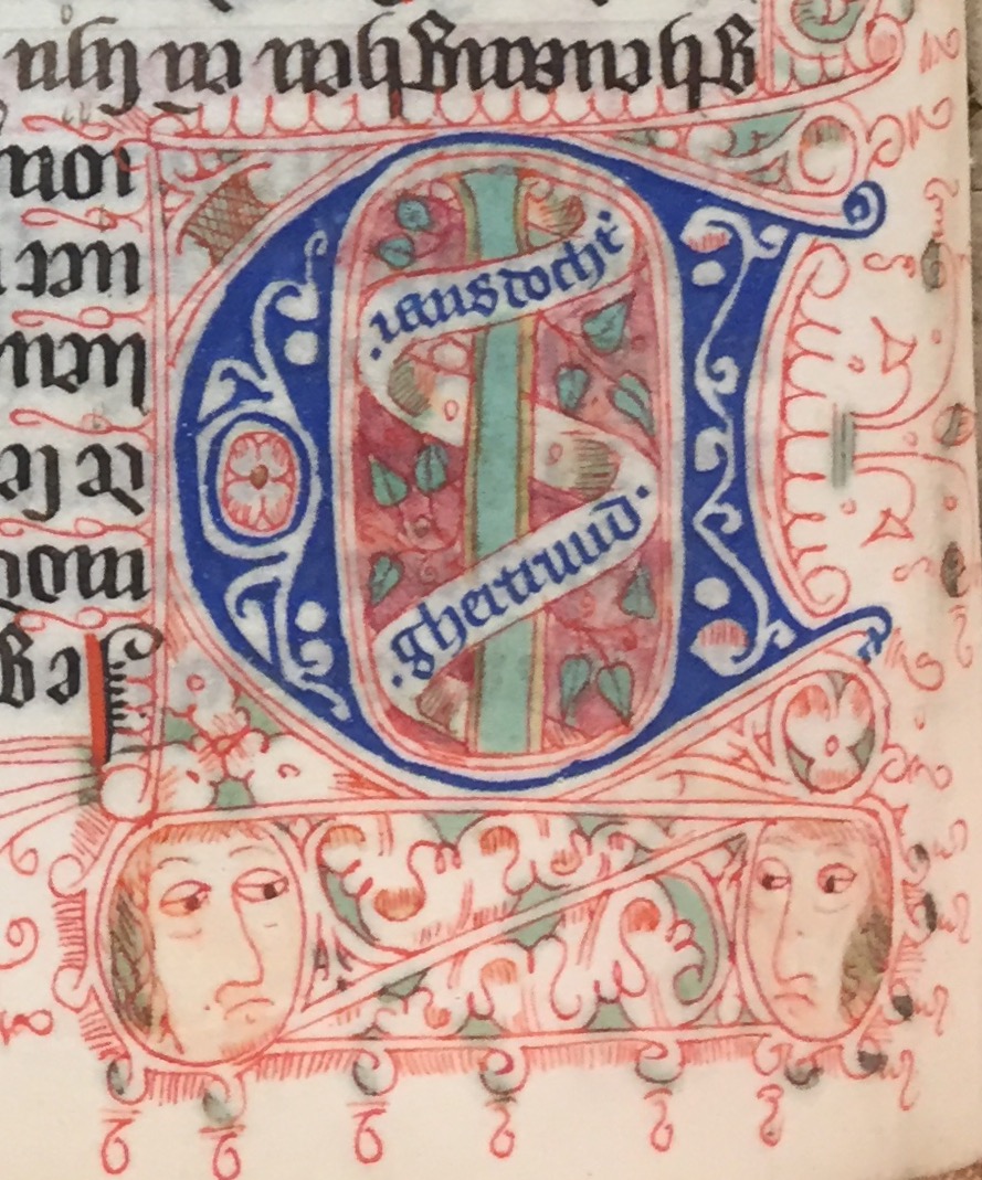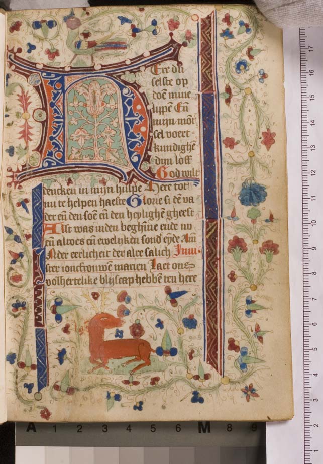 Een getijden- en gebedenboek hoogstwaarschijnlijk gemaakt in 1481 voor Geertruida Jansen (Gheertruud Jansdr.) uit Haarlem. Het is namelijk haar naam dat omgekeerd in spiegelbeeld op f. 124v staat in de initiaal D. Het handschrift telt 157 folia, heeft enkele fraai versierde pagina's met initialen en één grove miniatuur (f. 88v) van een gekruisigde Christus met ...