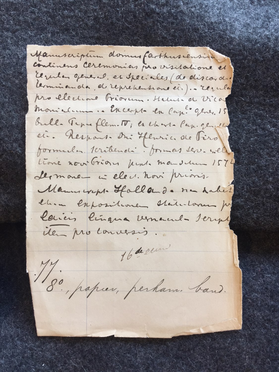 Een handschrift uit de Noordelijke-Nederlanden met regels voor de Orde der Karthuizers (Latijn), gedateerd rond 1570. Het handschrift (octavo formaat) telt 124 folia en zit nog in de orignele (slappe) band. De schutbladen (van perkament) komen uit de tweede helft van de 14de eeuw (Ordinarius).