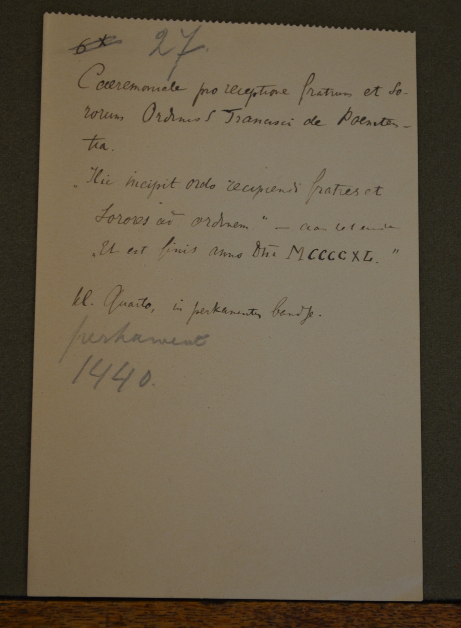 Een handschrift met de Ordines recipiendi voor de Orde der Franciscanen. Op f. 24r lezen wij 1440, Gumbert vermoedde dat het handschrift gebruikt is door de broeders van het sint Paulusklooster (Paulusbroedersklooster) te Amsterdam. Het op perkament geschreven handschrift telt 25 folia, hoefnagel muzieknotatie en enkele eenvoudige penwerkinitialen.