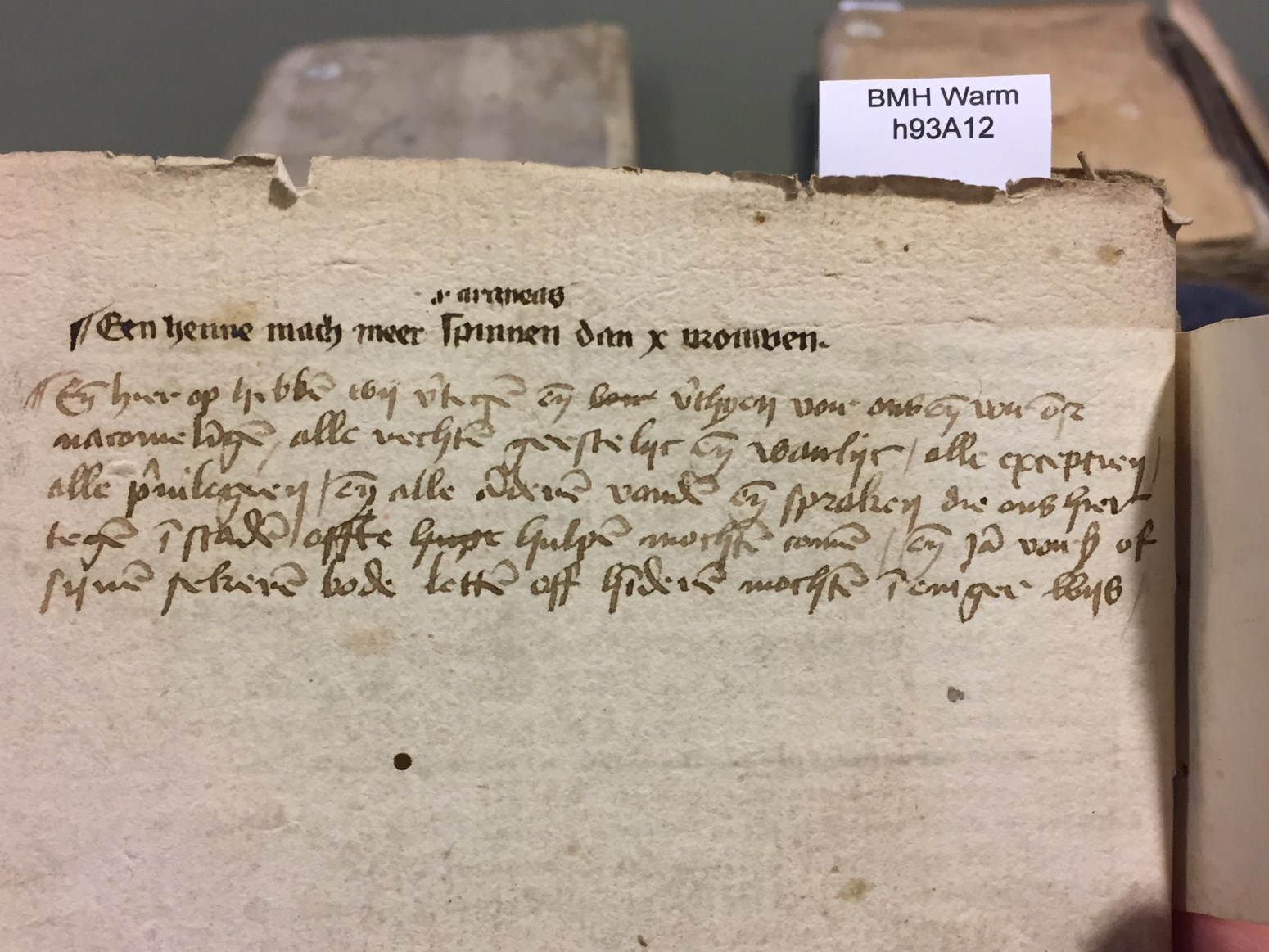 Rekeningen van het Zijlklooster (1481) te haarlem op papier (met deels verdwenen perkamenten omslag). Bijzonder is het raadsel op f. 38v. Araneus (de familie waartoe kruisspinnen behoren): Een henne mach meer spinnen dan 10 vrouwen.