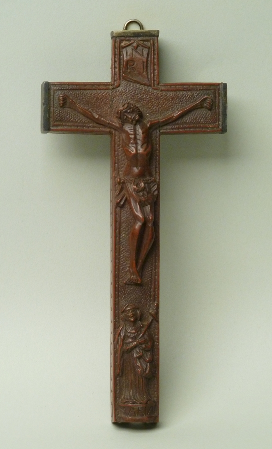 Reliekenkruisje, in hoogreliëf Christus, Maria eronder, kz. lijdenswerktuigen met relieken