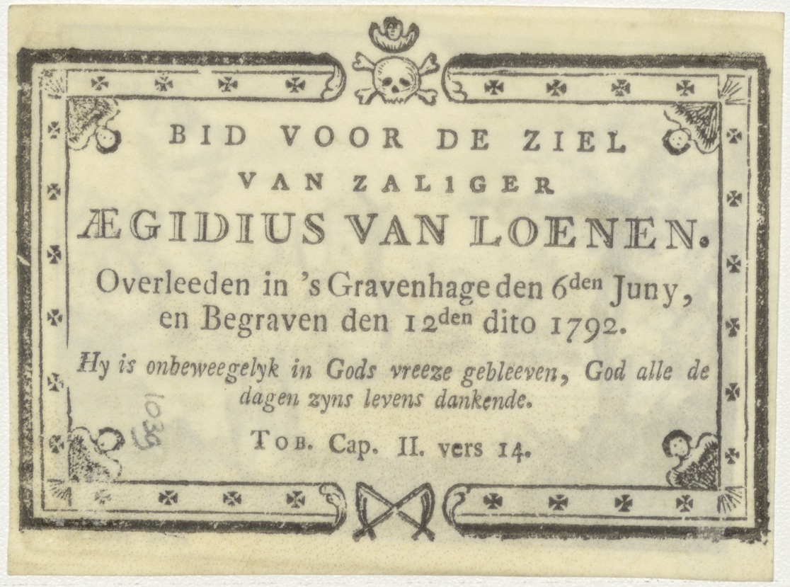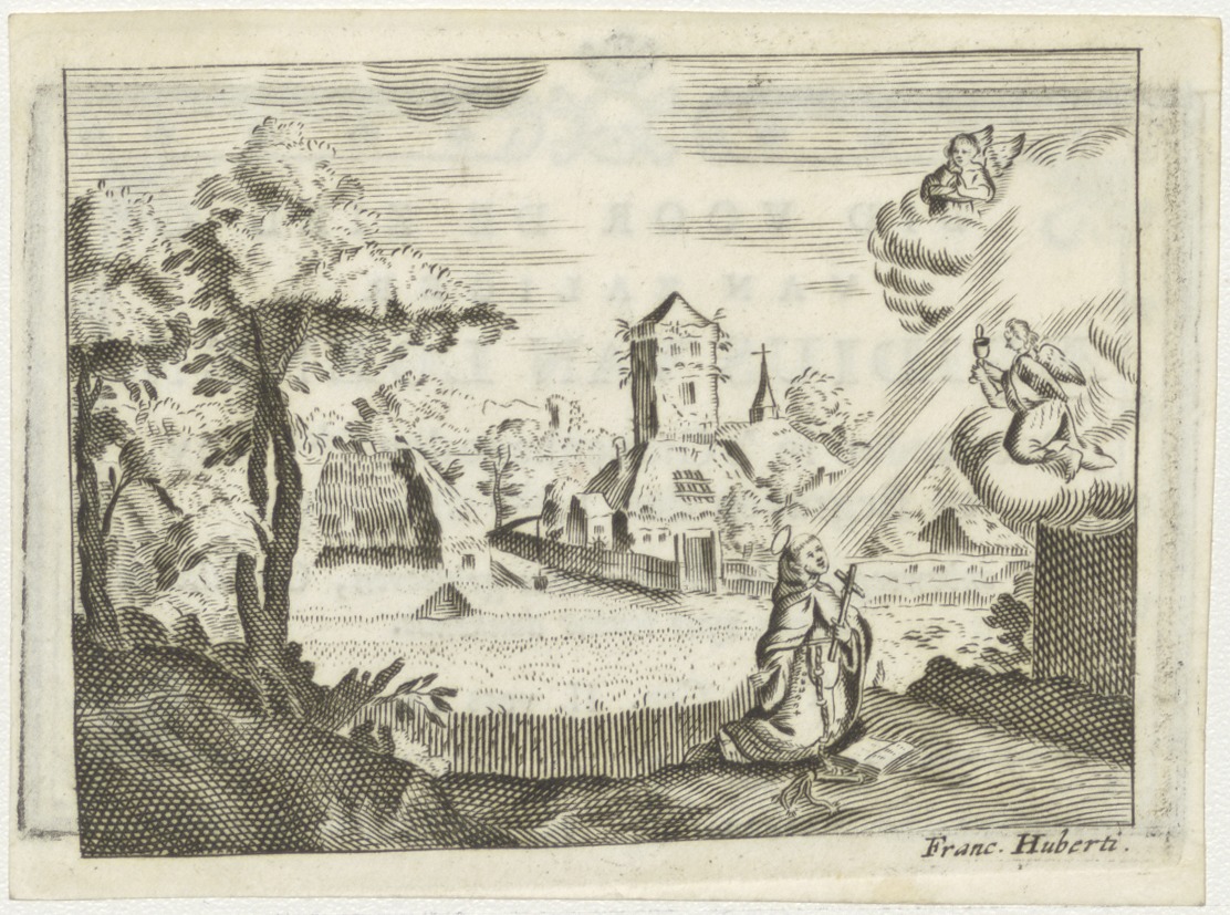 Landschap met knielende H. Franciscus met kruis, gesel en boek voor engel in wolk met kelk en hostie, kz. Bid voor ziel Aegidius van Loenen (+1792);Den Haag;