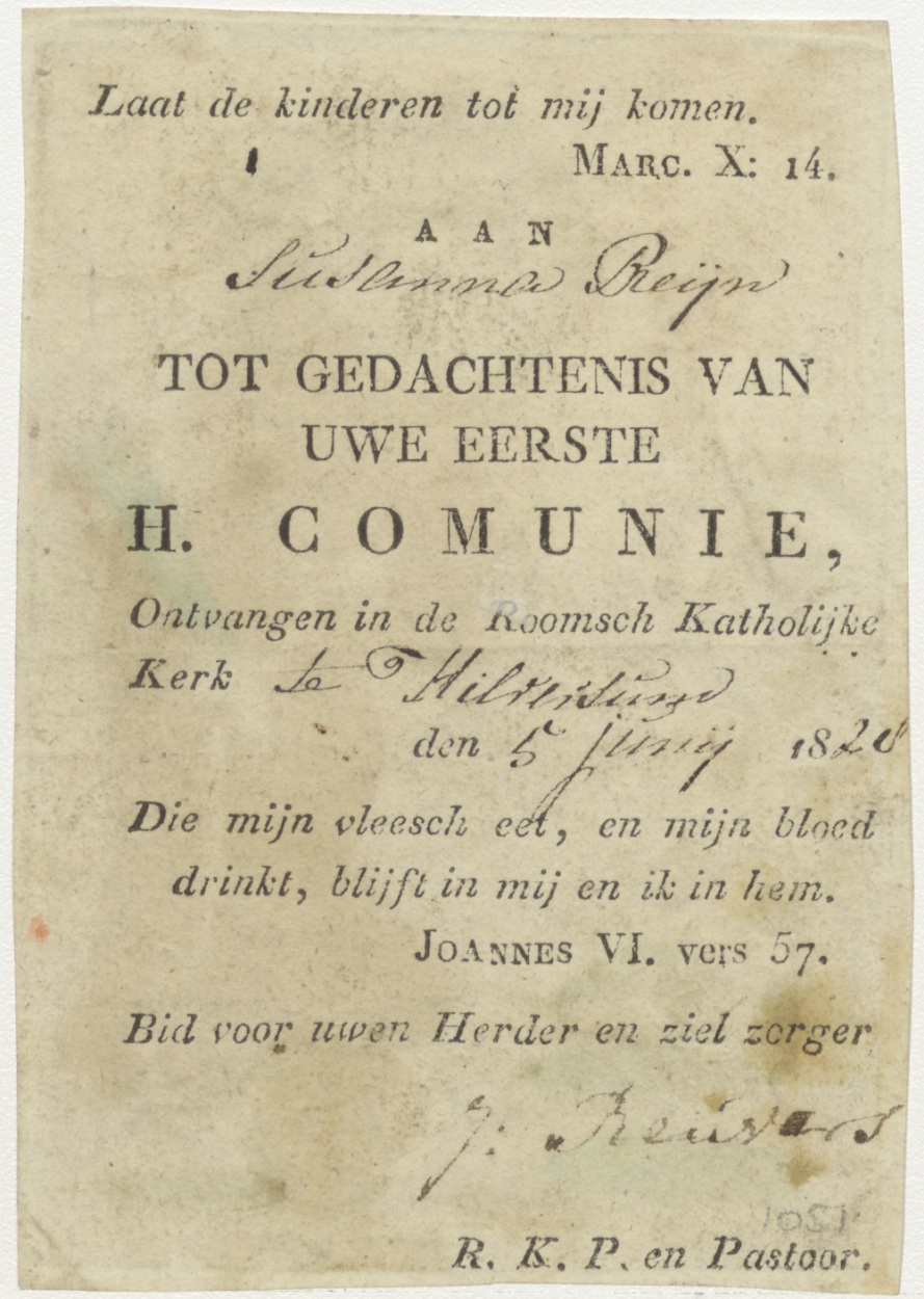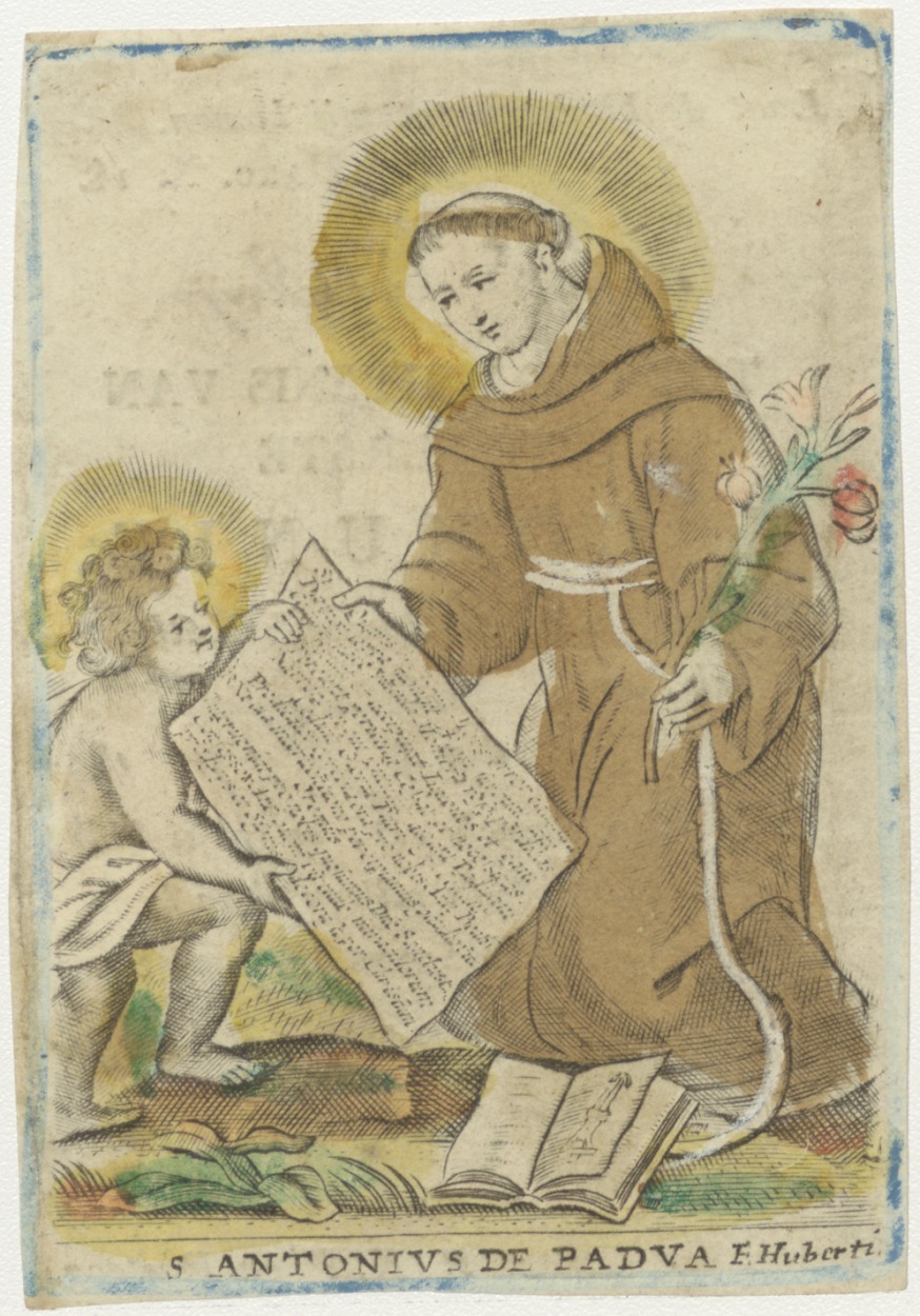 H. Antonius van Padua, ingekleurd, kz. H. Communie Reijn;1828;Hilversum(?);pastoor J. Renvers