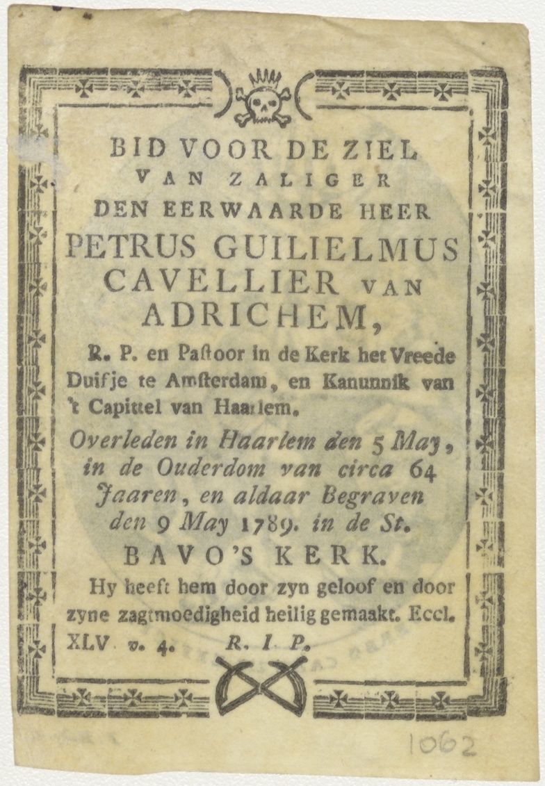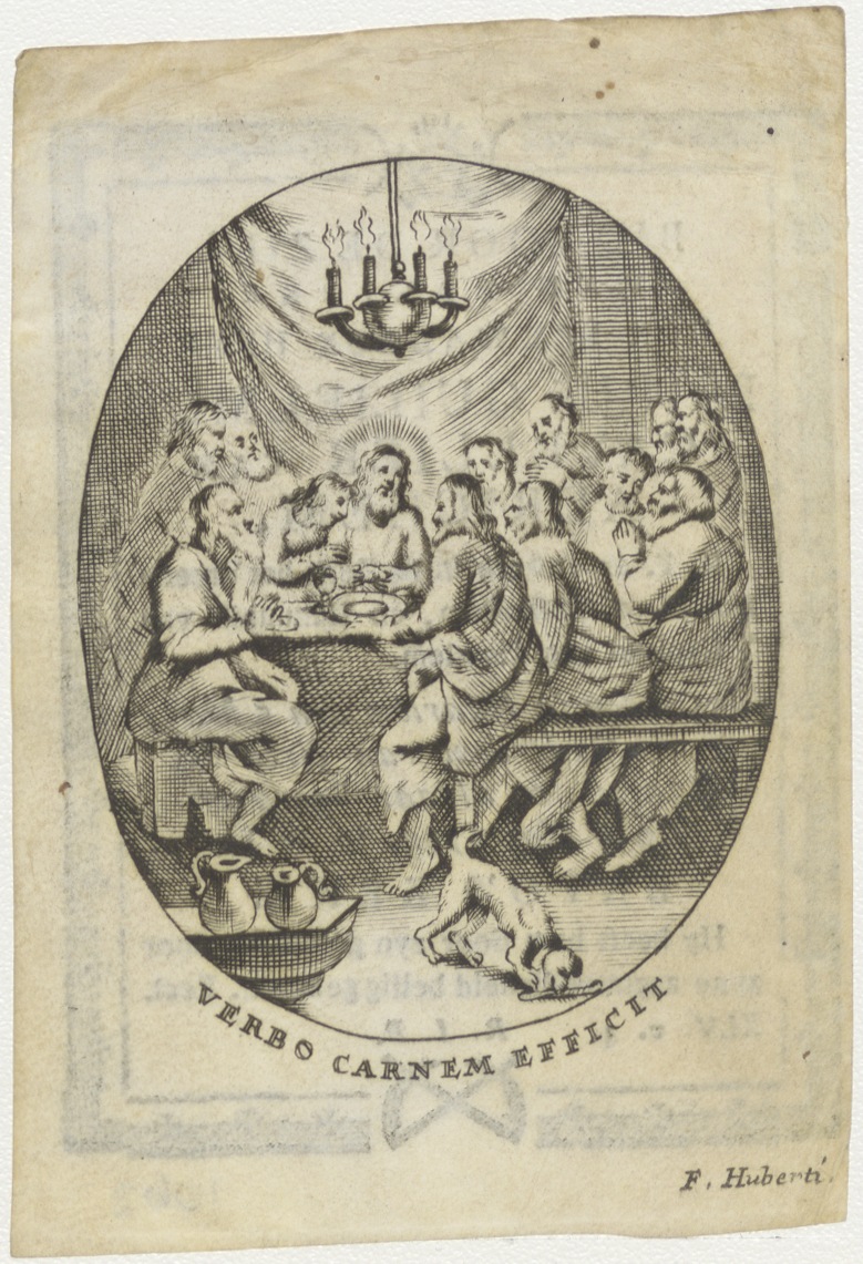 Laatste avondmaal Christus met zijn apostelen, kz. Religieus;Bid voor ziel Petrus Cavellier van Adrichem (+1789);kanunnik te Haarlem;pastoor;enz.;