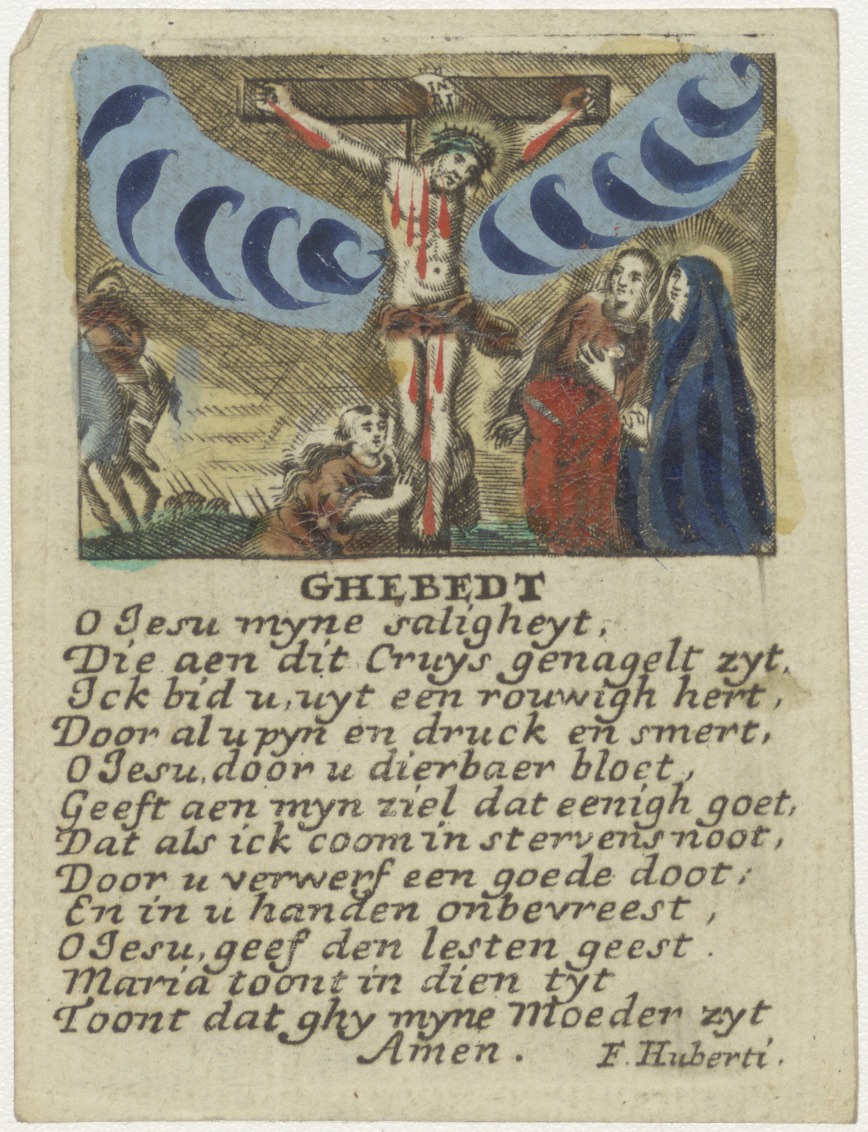 Gekruisigde Christus met Maria, Maria Magdalena, Johannes en gebed, passiescène, ingekleurd