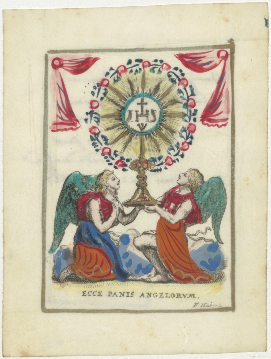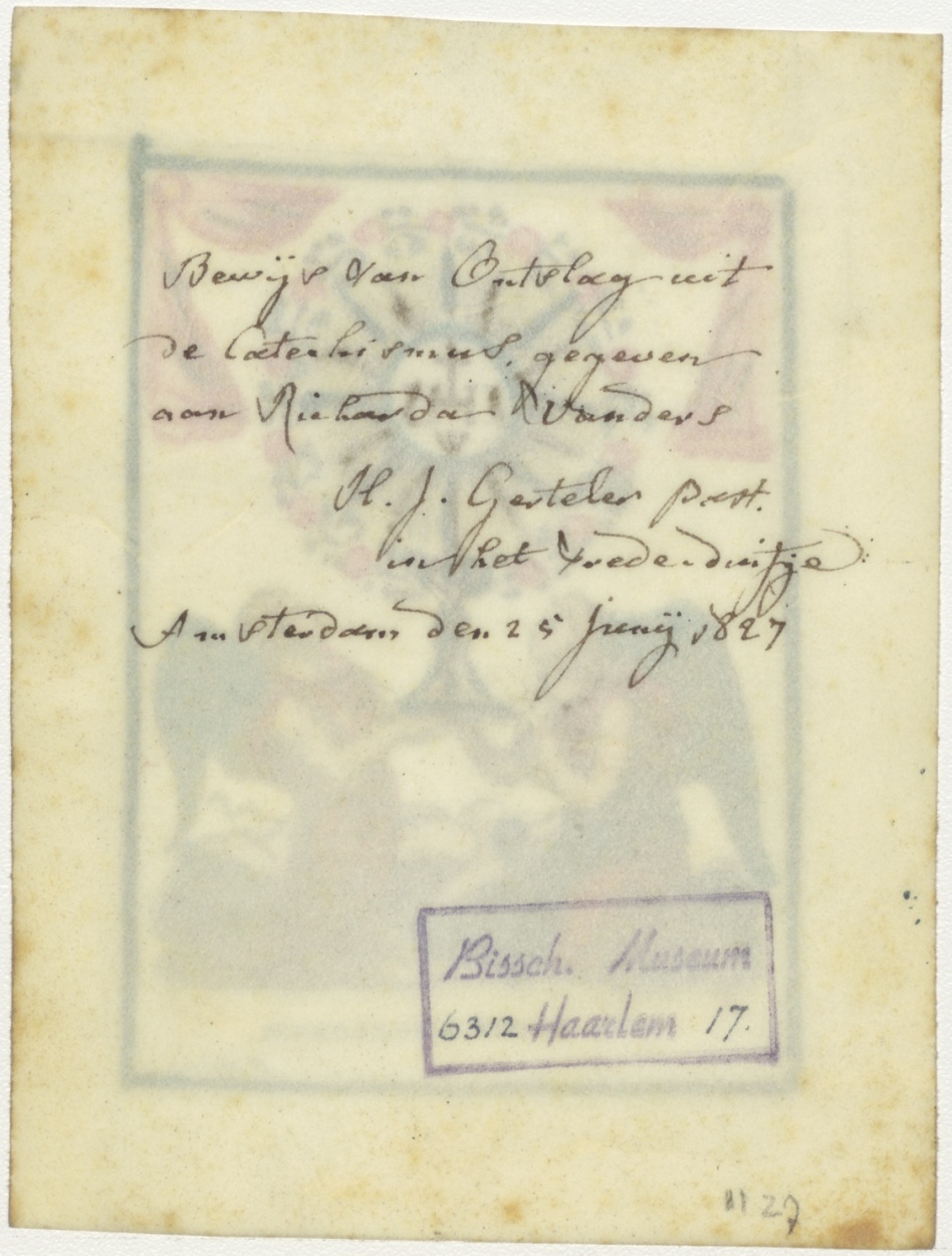 Aanbidding van H. Sacrament in monstrans, ingekleurd, kz. Bewijs van ontslag uit catechismus door pastoor Gerteler in Vrede Duifje Amsterdam 1827;