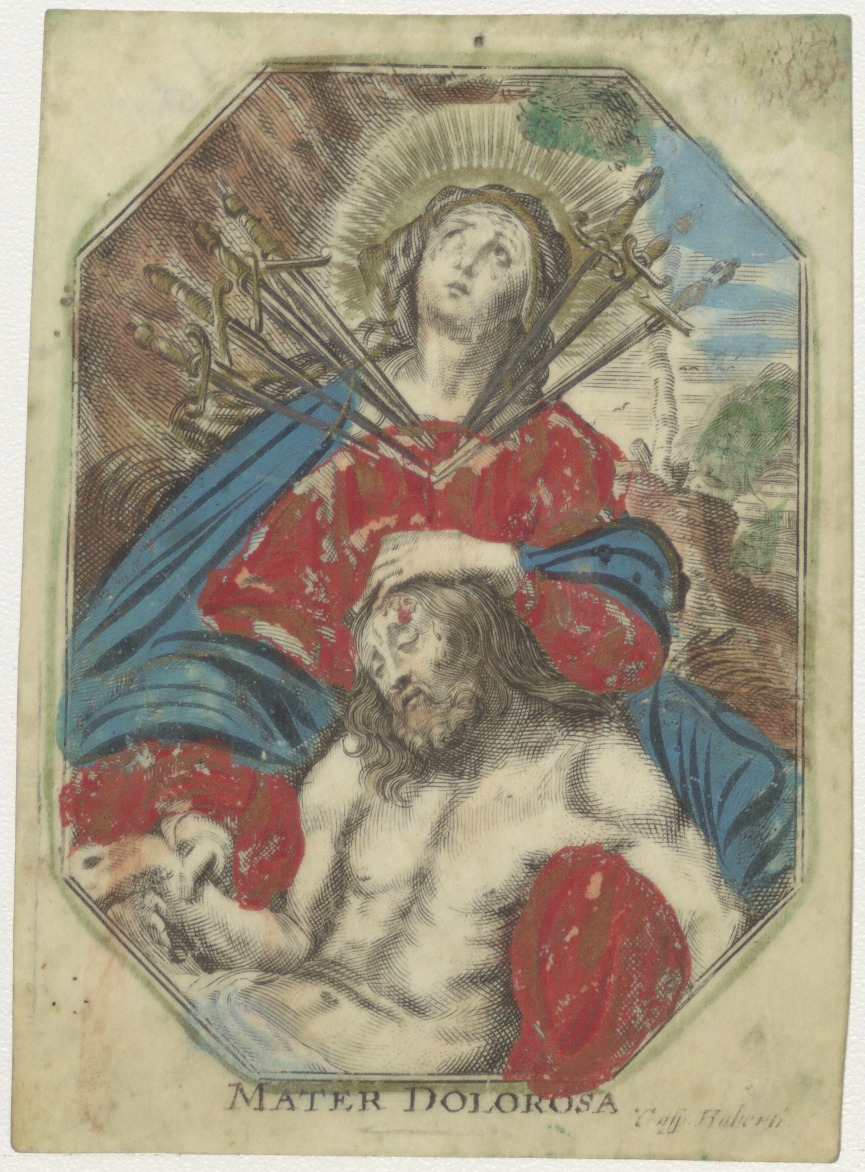 Maria Mater Dolorosa met Christus, piëta, ingekleurd, kz. tekst (Frans);
