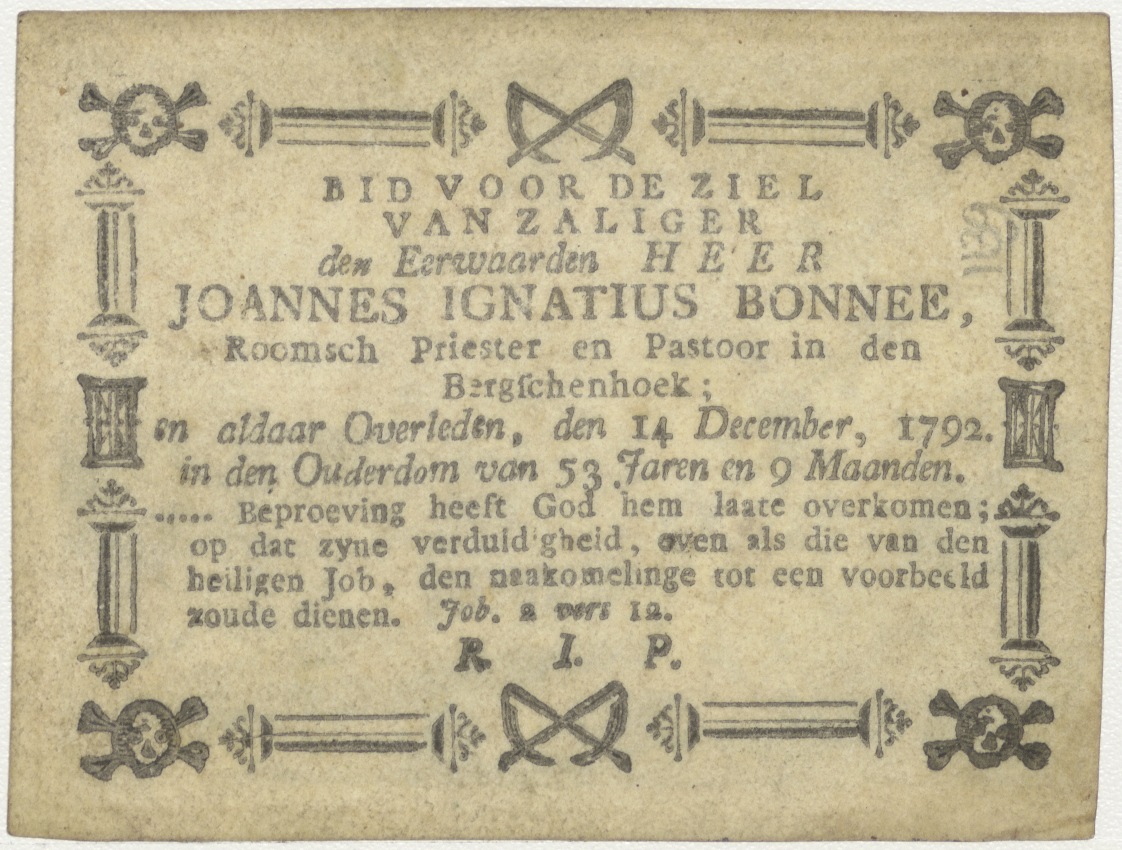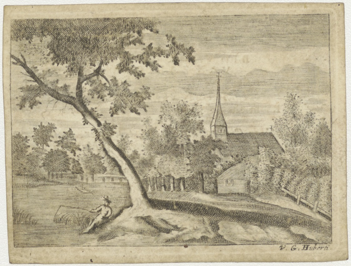 Landschap met vissende man en kerkje, kz. Religieus;Bid voor ziel Joannes Bonnee (+1792);priester te Bergschenhoek;