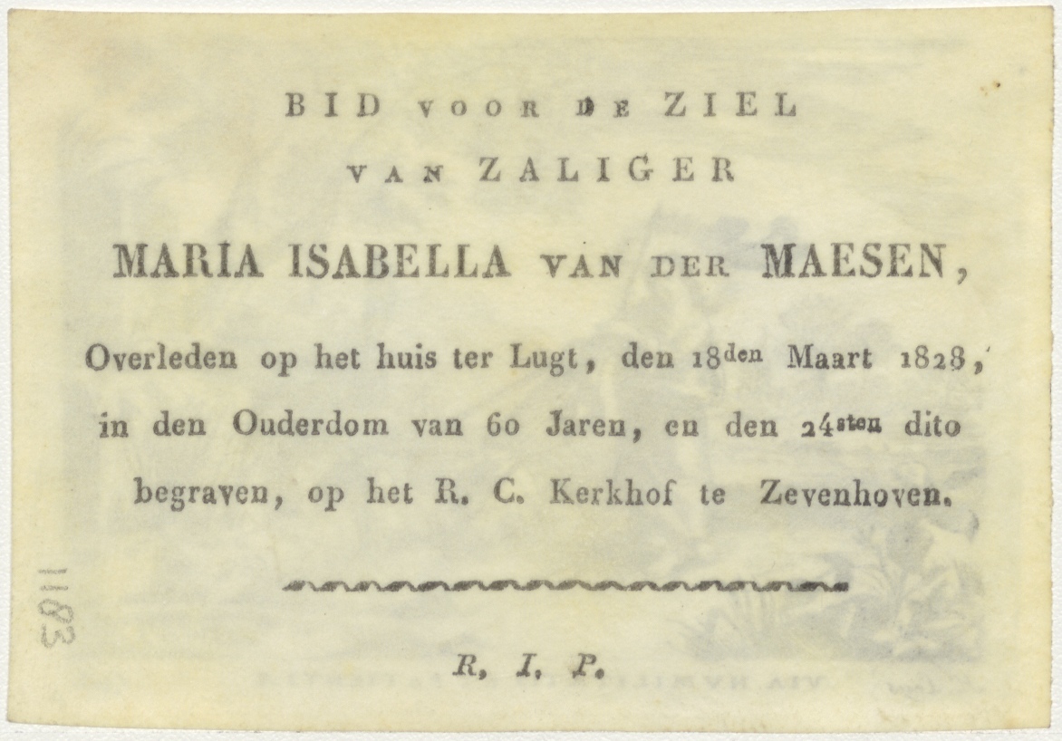 Christuskind met martelwerktuigen, kz. Bid voor ziel Van der Maesen (+1828);Zevenhoven;