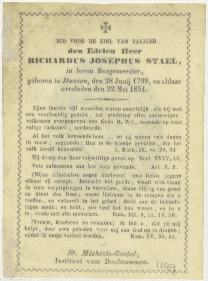Engelen waken bij overleden Christus, kz. Bid voor ziel Stael (+1851);burgemeester Dussen;