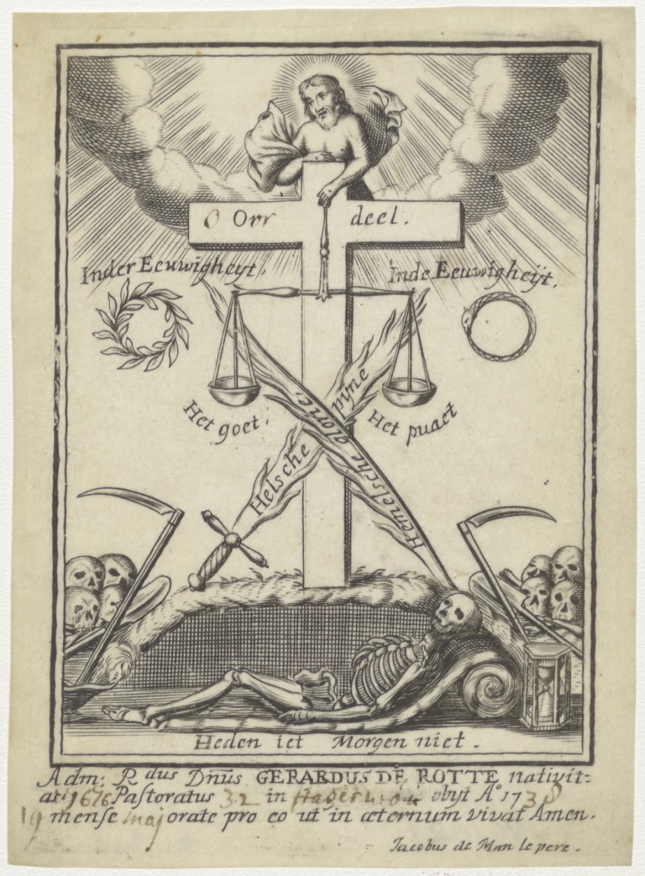 O Oordeel, Christus en kruis, laatste oordeel, kz. Op voorzijde;religieus;Gerardus de Rotte (+1738);pastoor te Hazerswoude;