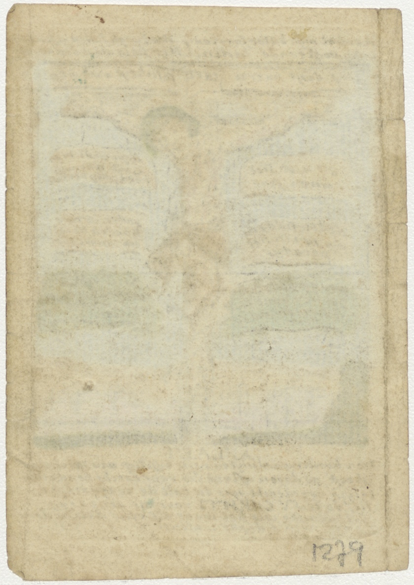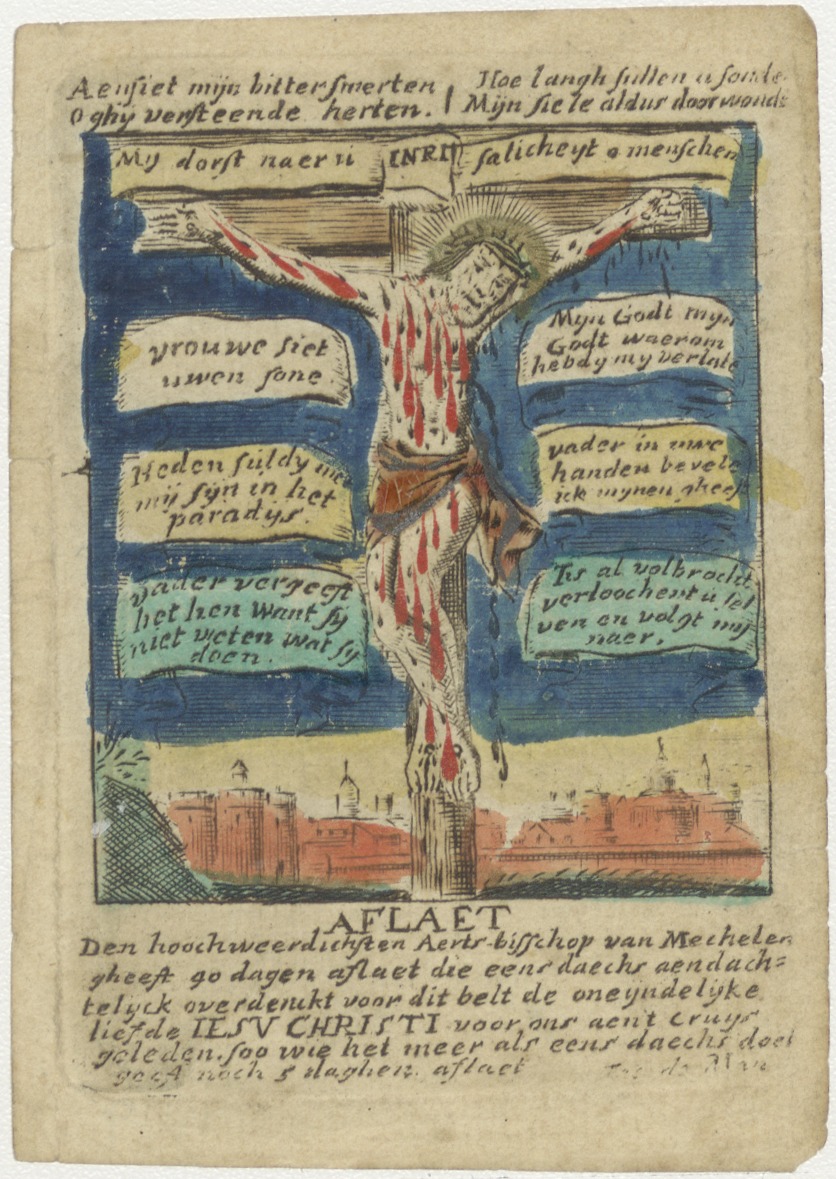 Lijdende Christus aan kruis met teksten, ingekleurd