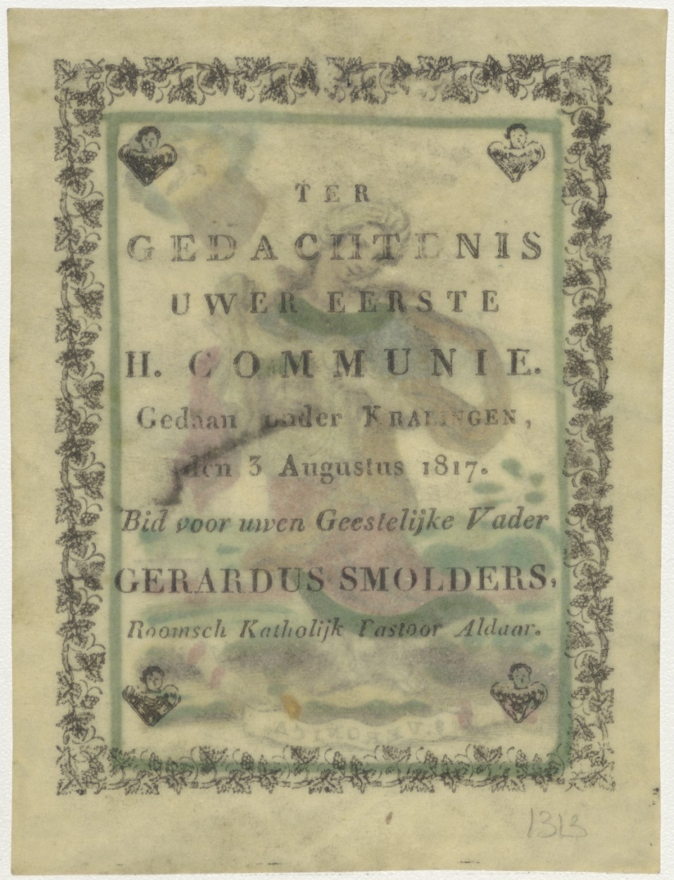 H. Veronica, ingekleurd, kz. H. Communie;1817 te Kralingen door pastoor Gerardus Smolders;