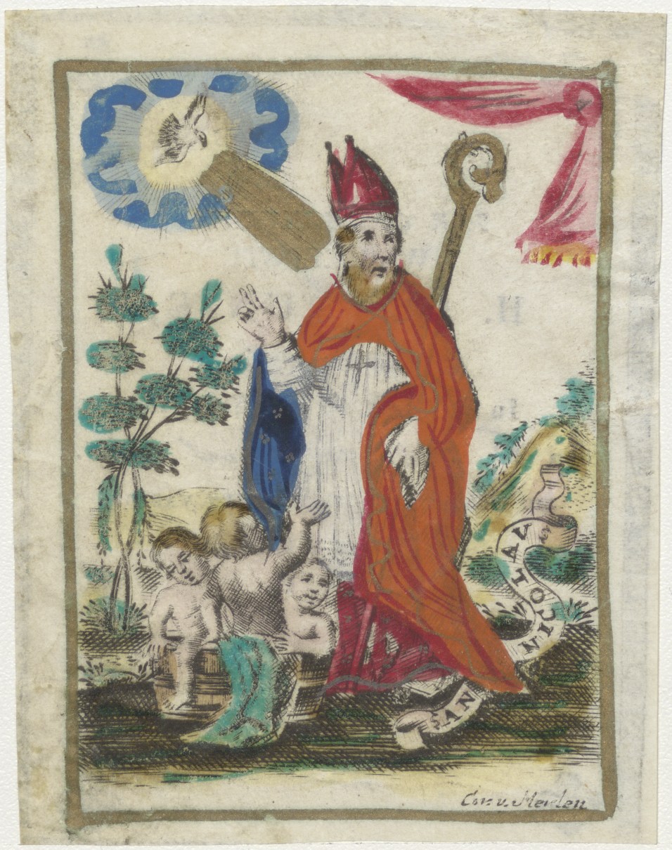 H. Nicolaus, ingekleurd, kz. H. Communie 1827;Steigerkerk Rotterdam;pastoor L.B. de Jong;