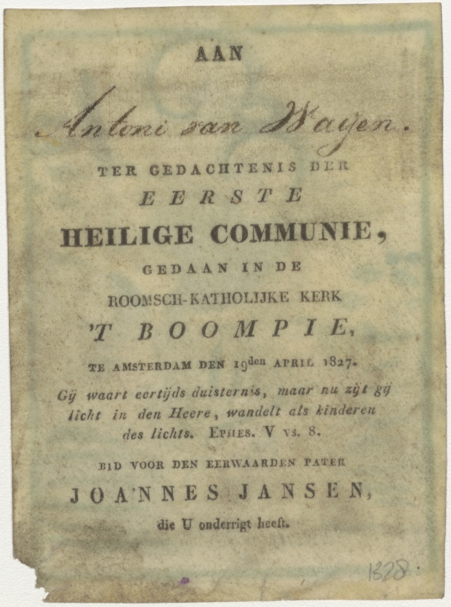 H. Antoneta, ingekleurd, kz. H. Communie Van Walgen;1827;pastoor Joannes Jansen;'t Boompje Amsterdam;