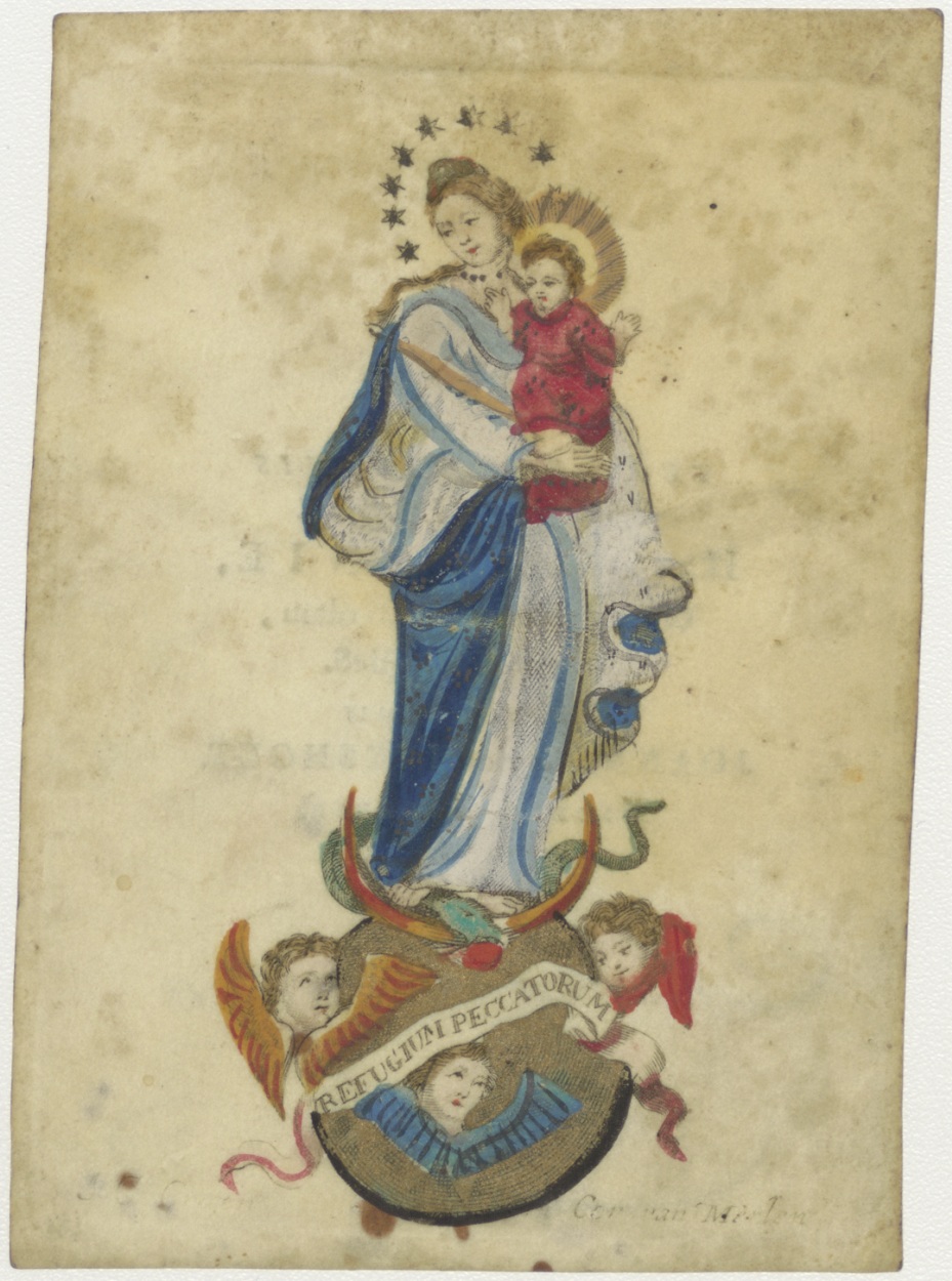 Maria met Christuskind, refugium peccatorum, ingekleurd, kz. H. Communie Versnel;1818;door pastoor Joannes van Lieshout;