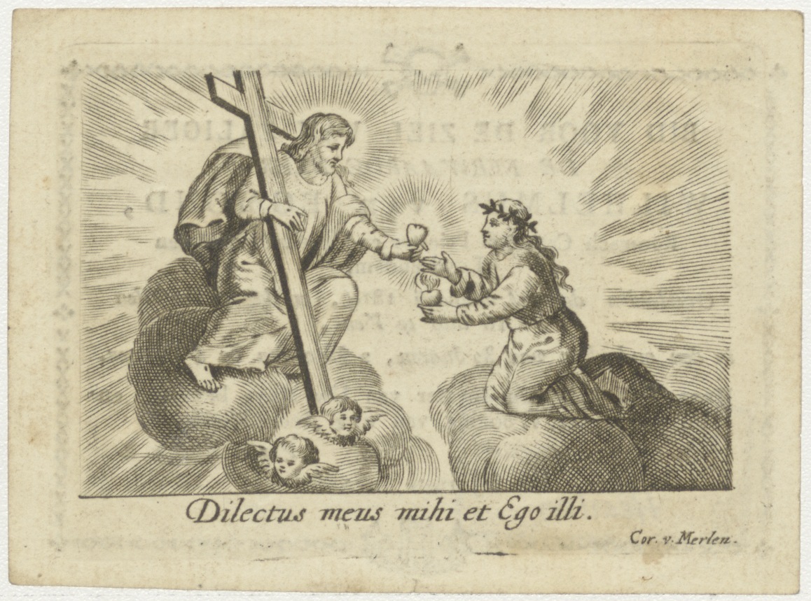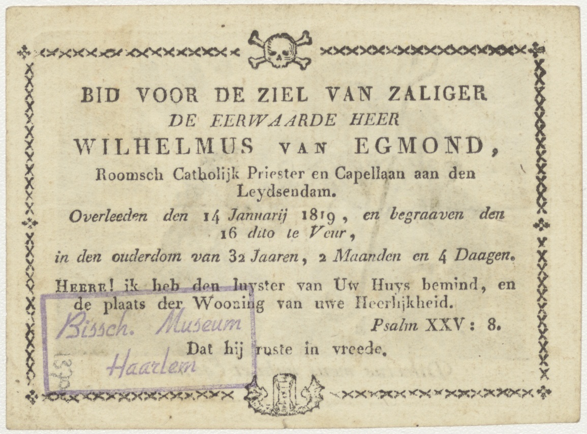 Christus geeft H. Hart aan vrouw op wolk, kz. Religieus;Bid voor ziel Wilhelmus van Egmond (+1819);pastoor Leidschendam