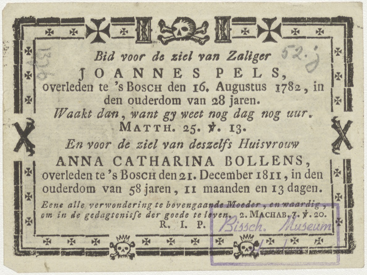 H. Rochus, kz. Bid voor ziel Pels (+1782);Bid voor ziel Bollens (+1811);Den Bosch;