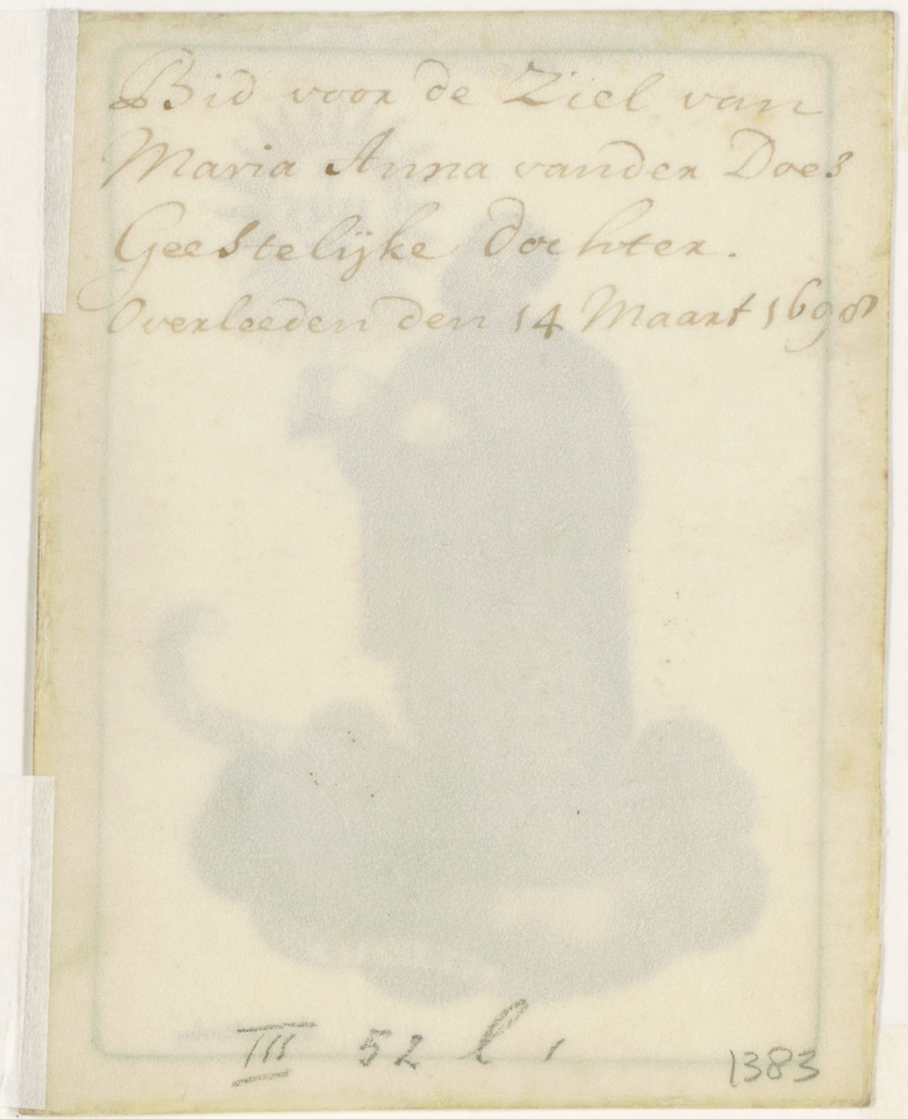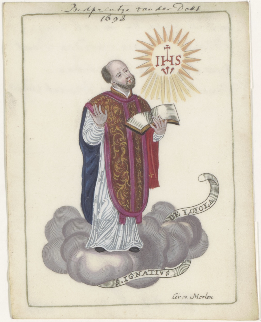 H. Ignatius van Loyola S.J., ingekleurd, kz. Religieus;Bid voor ziel Maria Anna van den Does geestelijke dochter (+1698);