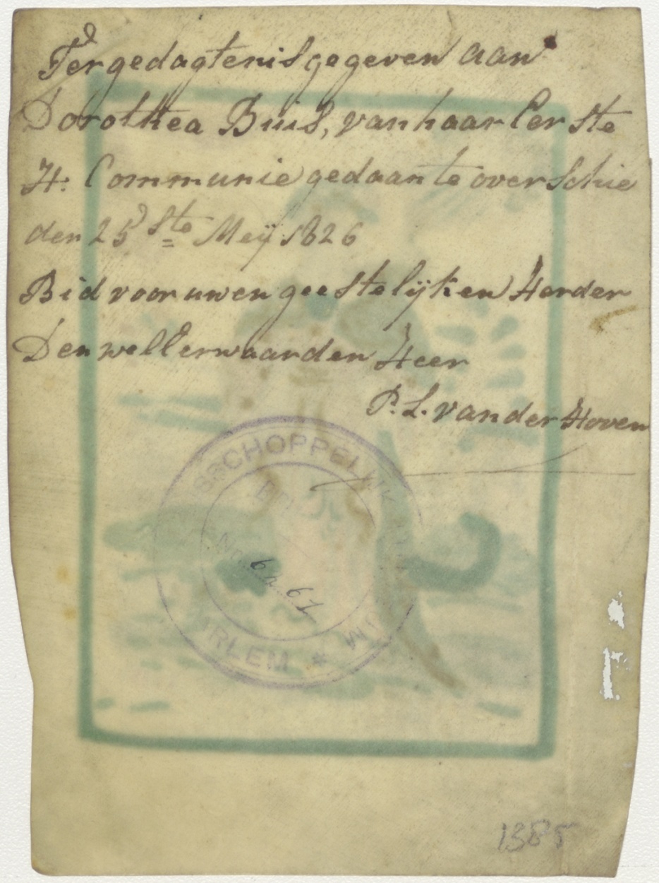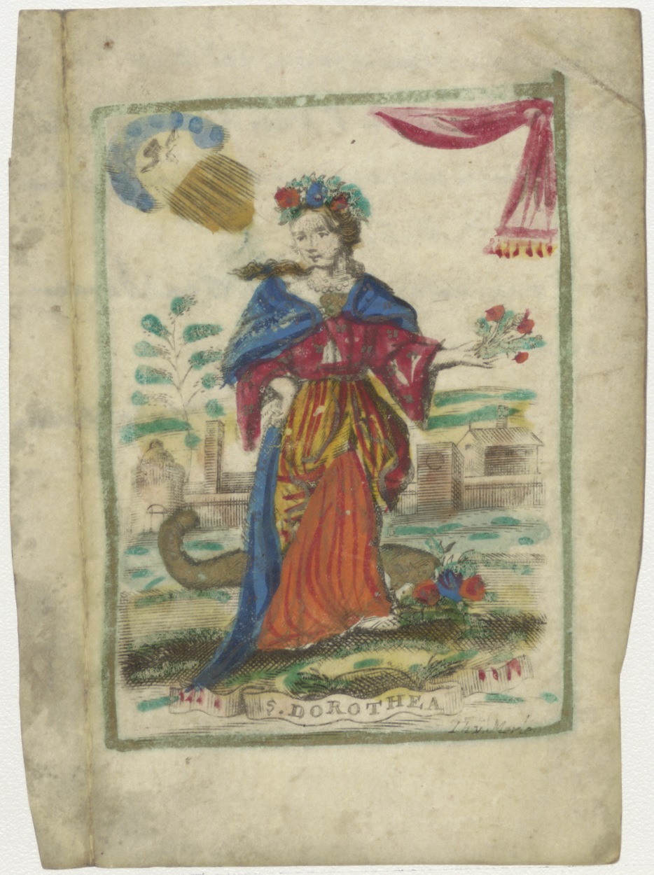 H. Dorothea, ingekleurd, kz. H. Communie Buis door pastoor P.L. van der Horen;1826;Overschie;