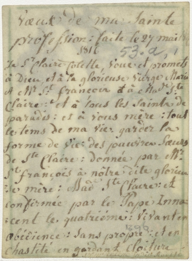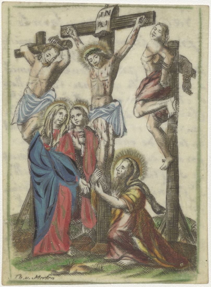 Passiescène, gekruisigde Christus met drie vrouwen, ingekleurd, kz. tekst (Frans);