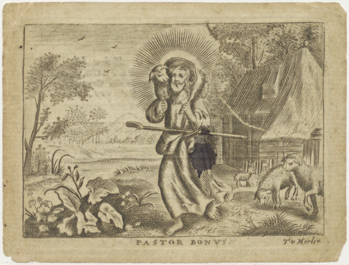 Pastor Bonus, Christus met schapen, kz. Religieus;Bid voor ziel Petrus van de Laar (+1819), Gemert, priester van de orde der Capucinen en rector der Latijnsche Scholen te Gemert