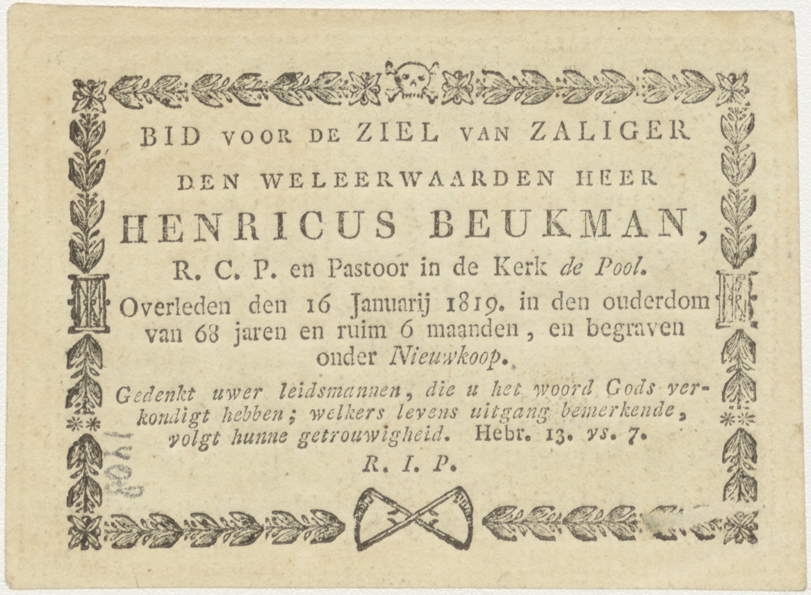 Maria met Christuskind en Johannes, kz. Religieus;Bid voor ziel Henricus Beukman (+1819);pastoor kerk De Pool;Amsterdam(?);etc.;